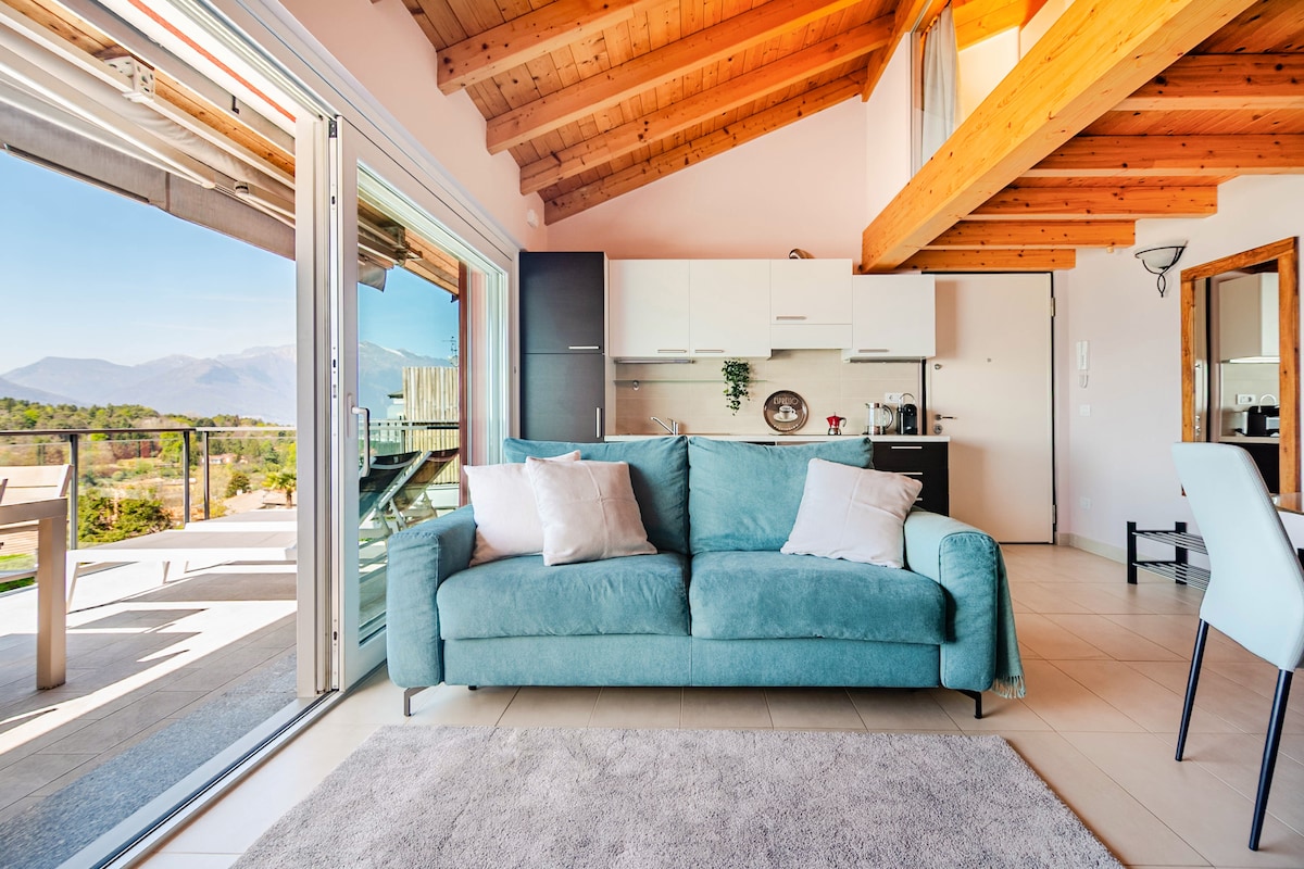 Appartamento di 35 mq, vista lago con soggiorno ( letto matrimoniale e divano-letto )bagno e cucina. Zona tranquilla e residenziale leggermente in salita. 5 minuti in auto dal centro città. Posto auto coperto, area esterna con giardino e piscina. Sat Tv. Piscina condivisa solamente con host, chiusa nel periodo invernale. Disponibilità di lettino/culla su richiesta.