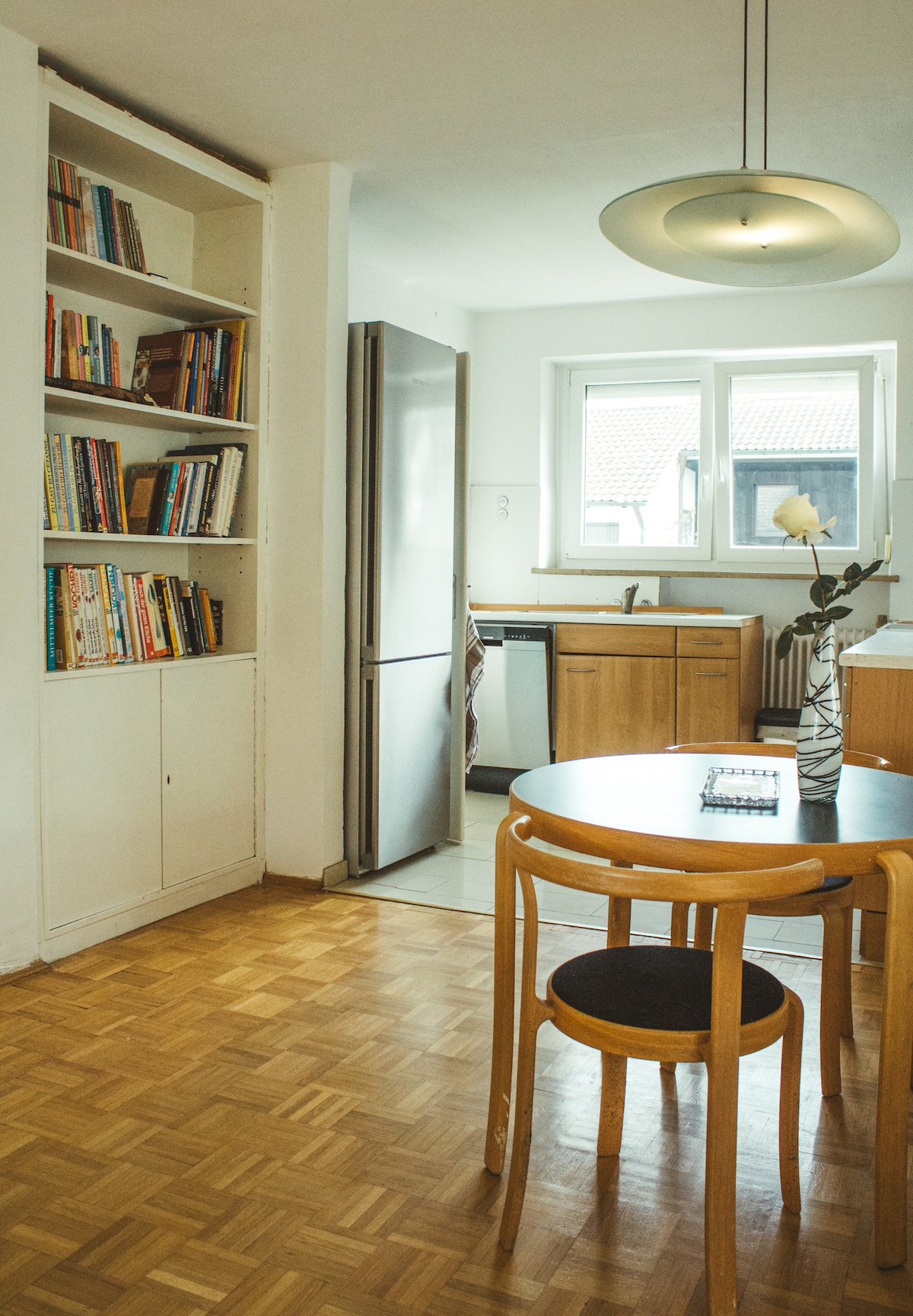 Kleine, offen gestaltete Ferienwohnung/ Einliegerwohnung im Erdgeschoß mit Einbauküche (Kaffeemaschine, Toaster, Wasserkocher, Kühlschrank mit Gefrierfach), Bad (Shampoo, Duschgel etc.) mit Dusche und WC, Handtücher, Bettwäsche, Föhn. Schlafzimmer mit Kleiderschrank, Wohnzimmer mit Schlafsofa, Esstisch, TV. Sagt uns gerne Bescheid wenn wir die Schlafcouch beziehen sollen. Familie mit Kinder sind herzlich willkommen, es ist ein Hochstuhl vorhanden sowie verschiedene Spielsachen.