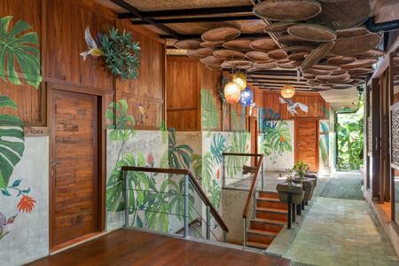 BARONG is a spacious furnished garden sanctuary in Penestanan, Ubud, ideal for monthly stays, remote work, or longer visits to Bali. Walking distance to Alchemy Yoga Center, cafés, and BGS, the home offers a peaceful setting surrounded by greenery while remaining close to Ubud Center. A suspended loft bedroom with large windows overlooks lush greenery, with a cozy daybed below. Enjoy a big open-air kitchen perfect for cooking, hammocks on the terrace, and a koi pond and fountain.