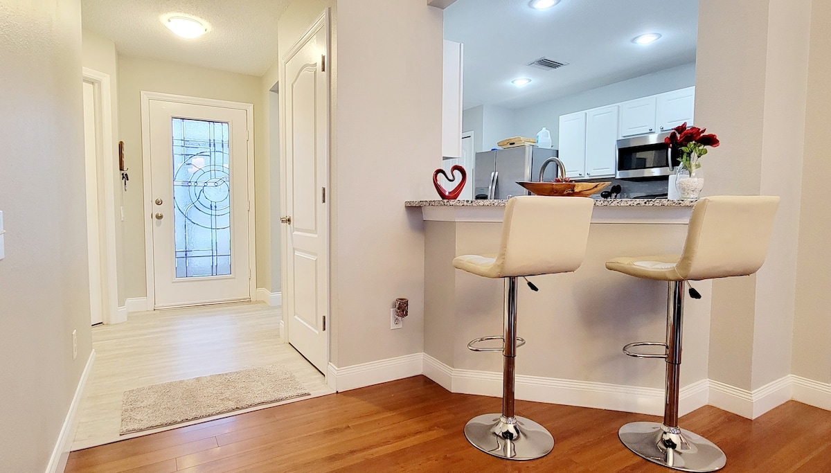Entdecken Sie den besten Ort, um den Sonnenuntergang zu genießen, und entspannen Sie sich mit Freunden und Familie. Wenn du dieses schöne Zuhause betrittst, wirst du sofort die Gemütlichkeit spüren, die es bietet, und du wirst dich wie zu Hause fühlen können. Du hast Zugang zu einem eingezäunten Hinterhof mit Blick auf einen schönen See mit den schönsten Sonnenuntergängen. Es gibt 2 Gemeinschaftspools, nur 1 Block entfernt. In der Nähe von Geschäften und Restaurants und weniger als 50 Minuten von schönen Stränden. Nur 30 Minuten vom Flughafen und den Busch Gardens entfernt.
