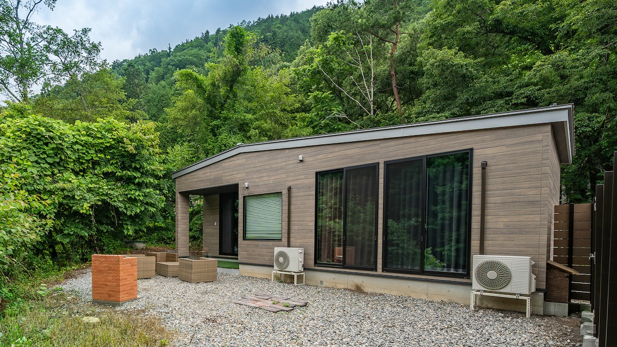 Private Cottage & Nature Sauna 57㎡ house for 1 group/day. Amenities: A/C, kitchen, washer/dryer, 140" theater. Capacity: Max 6 guests. (4 beds total: Includes 1 double sofa bed. Guests must set up the sofa bed.) Sauna: Free, timed sessions. Reserve via tablet. Swimwear required. BBQ: Garden grill available. Bring charcoal & food. (A 30cm disposable mesh is in the kitchen). Notes: Cleaning every 3 days for long stays. Check map before arrival. Insects may enter. No karaoke.