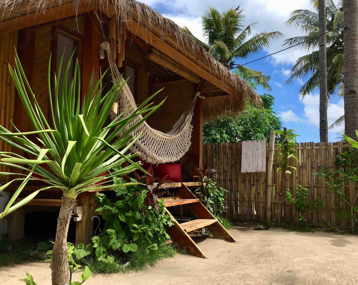 Traditional grass-roofed bungalow (1 of just 4) only minutes walk from beautiful white sand beaches and turquoise ocean. Set in a coconut grove on the edge of a village. King double bed, with A/C & bedside fan. Private bathroom, terrace & garden, free WIFI. Competitive rates as not beachfront, but very pleasant, comfortable rooms with delicious breakfast included. Check out our story on social media :). Clean, hygienic, easy to distance.