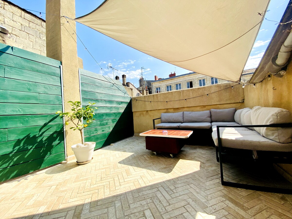 Der ideale Ausgangspunkt, um Bordeaux zu entdecken! Eine atypische Wohnung in einer alten Druckerei aus dem frühen 20. Jahrhundert. Die Maisonettewohnung liegt in der zweiten Reihe hinter dem Hof und profitiert von einer ungeahnten Ruhe im Herzen des Viertels St. Michel. Im ersten Stock befindet sich das große Wohnzimmer (Wohnzimmer, Büro, Bar und offene Küche) und die Badezimmer; im zweiten Stock finden Sie das Hauptschlafzimmer und die riesige Terrasse, die nicht einsehbar ist. Super ausgestattet, modernes und klares Dekor... GEMÜTLICH!