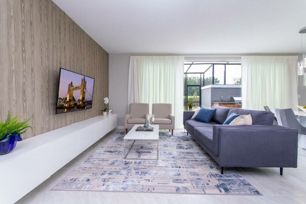 Relax in this stylish boho-inspired townhome, designed to be your cozy home away from home just 15 minutes from Disney. Perfect for families, this space blends comfort, warmth, and a laid-back vacation vibe. Unwind in a California King Tempur-Pedic bed, enjoy peaceful pond views, and take advantage of resort amenities like a pool, gym, and clubhouse after a day at the parks.