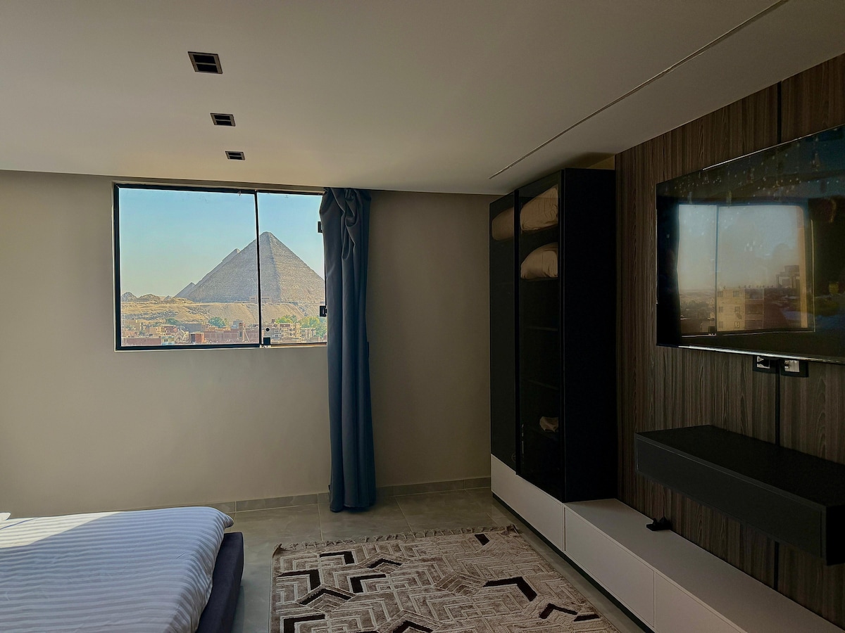 Atemberaubendes Studio mit spektakulärem Blick auf die Pyramiden in der ersten Reihe. Mit der einfachsten Zugänglichkeit für eine Immobilie mit Pyramidenblick, direkt an der Hauptstraße und direkt neben dem neuen Großen Ägyptischen Museum. Dieses neu eingerichtete, sonnige Studio ist genau das, was du für einen bequemen und angenehmen Aufenthalt während deiner Reise in Ägypten benötigst.