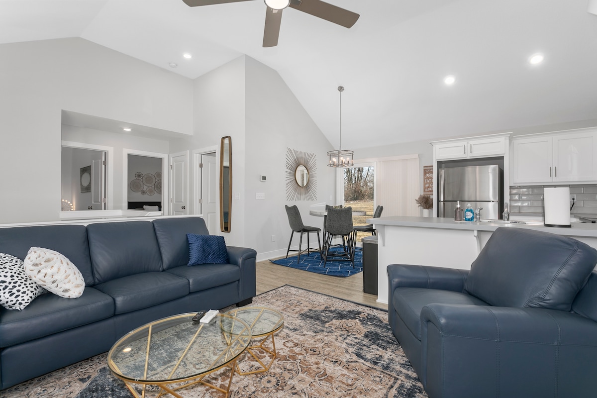 Dieser brandneue, kürzlich renovierte 1200 Quadratfuß große Raum bietet alles. Offenes Raumkonzept mit Wohnzimmer, Bar, Laufband, Tischfußball, neu vergrößertem Schlafzimmer und schönem, großem Badezimmer. Eigener Eingang mit großzügiger Terrasse mit Blick auf den Hinterhofwald. Alle Haustiere sind ohne zusätzliche Kosten willkommen. Sie lieben den großen eingezäunten Hinterhof zum Laufen und Spielen. Wir haben unsere eigenen Hunde und sie interagieren mit den Haustieren unserer Gäste, wenn du möchtest. Dieser Ort ist 15 Minuten von der Innenstadt von KCMO entfernt. Keine Reinigungsgebühr
