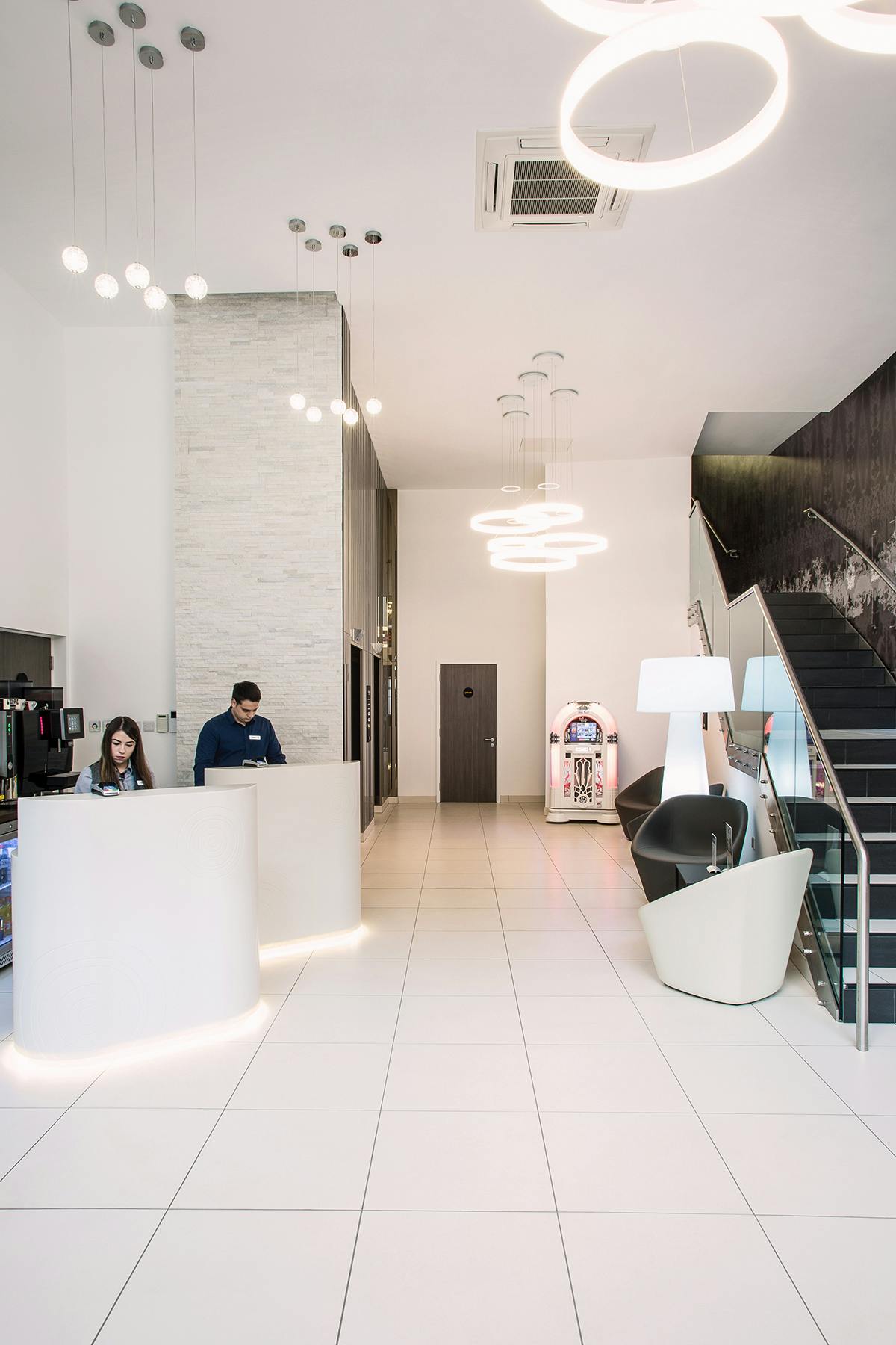 Das Executive-Doppelzimmer bietet einen geräumigen Rückzugsort mit einem Kingsize-Bett und einem eigenen Badezimmer mit Regendusche. Zur Ausstattung gehören ein Wasserkocher mit kostenlosem Tee und Kaffee, ein 43-Zoll-Flachbildfernseher, kostenloses WLAN, ein Arbeitsplatz für Laptops, ein Kleiderschrank, Verdunkelungsvorhänge, tägliche Zimmerreinigung und eine Klimaanlage. Die sozialen Räume im Erdgeschoss umfassen eine Bar, einen Fitnessraum und ein Restaurant. Ideal für digitale Nomad:innen.