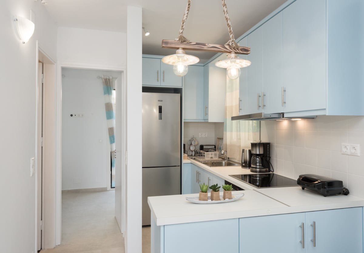 Unsere komplett renovierte Wohnung im modernen Stil mit ihrem kleinen Hof liegt über einem der schönsten Strände der Insel Korfu. Ideal für Paare, die eine tolle Zeit in einer tollen Gegend suchen. Die voll ausgestattete moderne offene Küche ermöglicht es dir, zu kochen und deine Mahlzeiten mit Blick auf das Meer zu genießen. Komfortables Sofa, großer LCD-Smart-Flachbildschirm und Kabel-Sat-TV, Klimaanlage, Sofa, Cocomat-Doppelbett. Duschbad. Starling-Satelliten-WLAN ist ebenfalls in der Wohnung installiert!