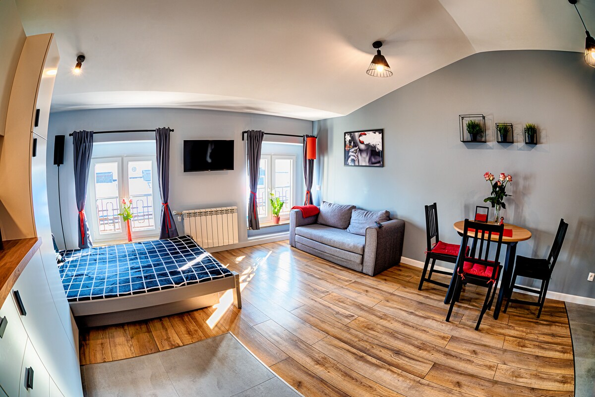 Stilvolles Studio-Apartment, ideal für eine Übernachtung im Herzen von Łódź. 1 km von der Piotrkowska-Straße entfernt - der berühmten Fußgängerzone von Łódź. Dank der Schlüsselsafes erfolgt das Ein- und Auschecken einfach, selbstständig und schnell. Den Gästen steht ein Schlafsofa und ein Zwischengeschoss-Schlafzimmer zur Verfügung. Das Apartment befindet sich im Hinterhaus eines revitalisierten Mietshauses in Łódź. Es verfügt über eine voll ausgestattete Küche und alle notwendigen Reinigungsmittel und Annehmlichkeiten.
