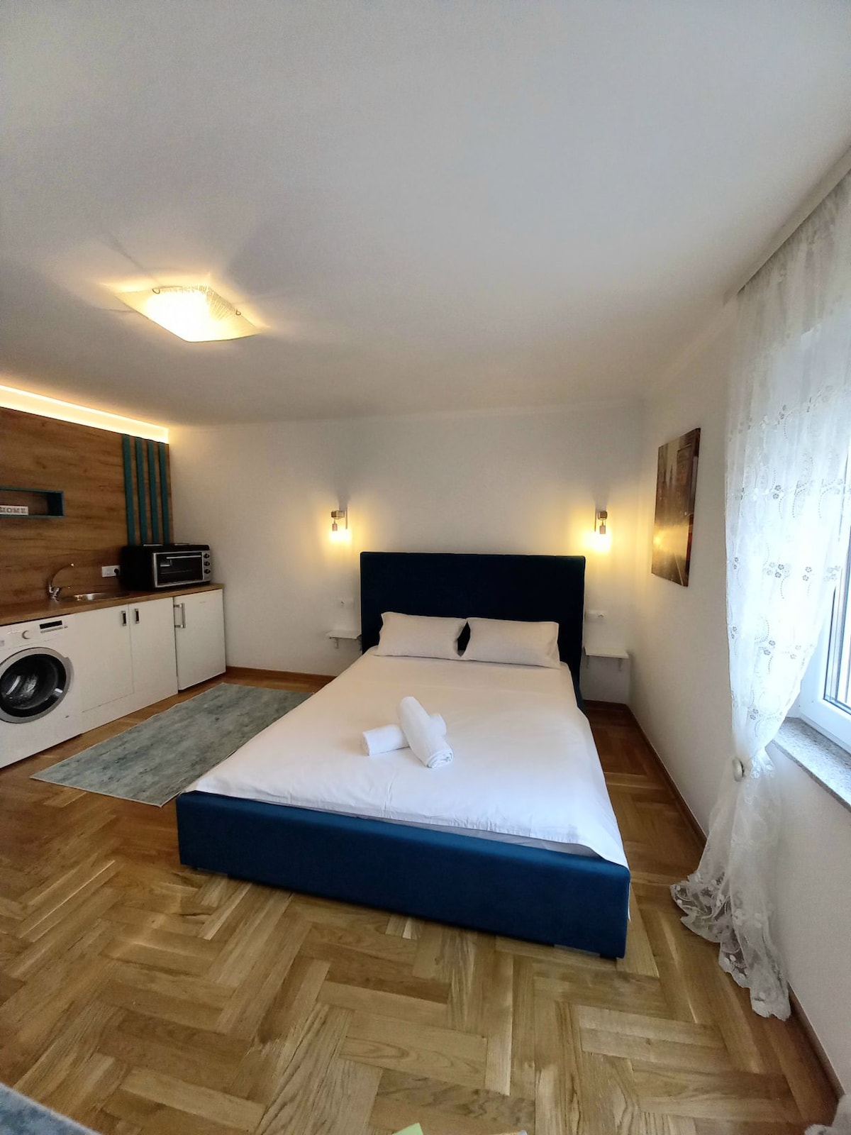 Genieße ein stilvolles Erlebnis in dieser zentral gelegenen Unterkunft in einem brandneuen Gebäude. Die Wohnung besteht aus einem hellen Schlafzimmer mit einem bequemen Kingsize-Bett, einem Esstisch für 4 Personen und einer modernen, voll ausgestatteten Küche. Ein sonnendurchflutetes Wohnzimmer mit Smart-TV. Die ausziehbare Ecke im Wohnzimmer kann auch als zusätzliches Bett für 2 weitere Gäste dienen. Die gesamte Wohnung wurde vom Architekten (Adil Glavovic – axisarchiteture) entworfen.