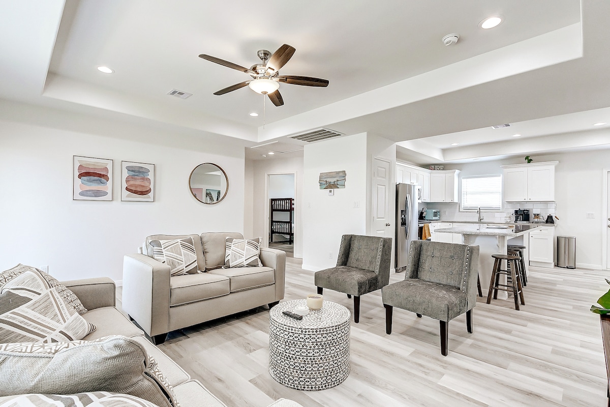 BEACHSIDE BLISS is a luxurious and stunning cottage located just a few steps from the beach, offering breathtaking panoramic views of the ocean. This luxury home is great for family gatherings, where you can enjoy the fresh ocean breeze and the soothing sound of waves. The balcony provides spectacular sunrise and sunset views and is ideal for viewing Galveston lights at night. Come spend some time here @ BEACHSIDE BLISS!