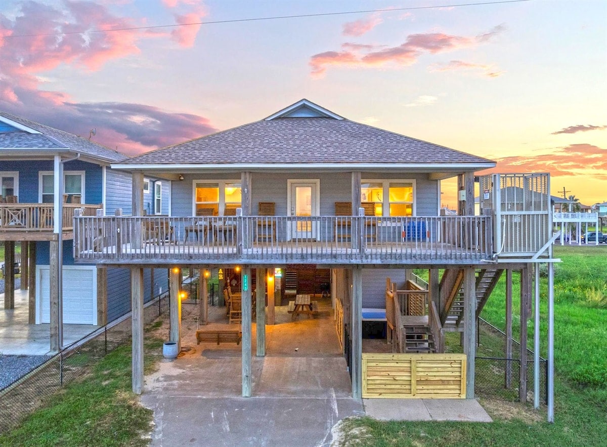 • Hot tub, outdoor putting green & game room with ping pong, foosball & darts! • Amazing 2nd floor wraparound deck space with 270° views • Gorgeous outdoor tiki bar, fire pit, hammocks & more! This home is centrally located in Crystal Beach with shops and restaurants just a 2 min drive away! Or, you can stay home & sip coffee & beach views on the back porch The trendy, fully stocked kitchen has a full coffee bar & is ready for you to enjoy a meal or drinks with friends & family
