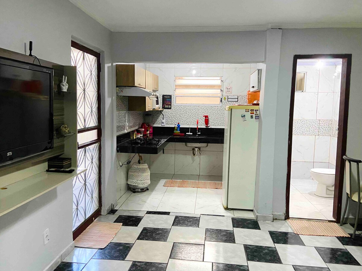 Agradável acomodação tipo quitinete privativa de 1 quarto. Montada com bastante carinho, oferece todo o necessário para uma estadia confortável. Possui cozinha completa, Ar split, Smart TV, Wi-Fi e área de serviço privativa com máquina de lavar, tanque e varal. Estamos localizados no Jardim Nova Esperança, região noroeste de Goiânia. Um bairro tipicamente residencial com várias opções de conveniência e lazer disponíveis.