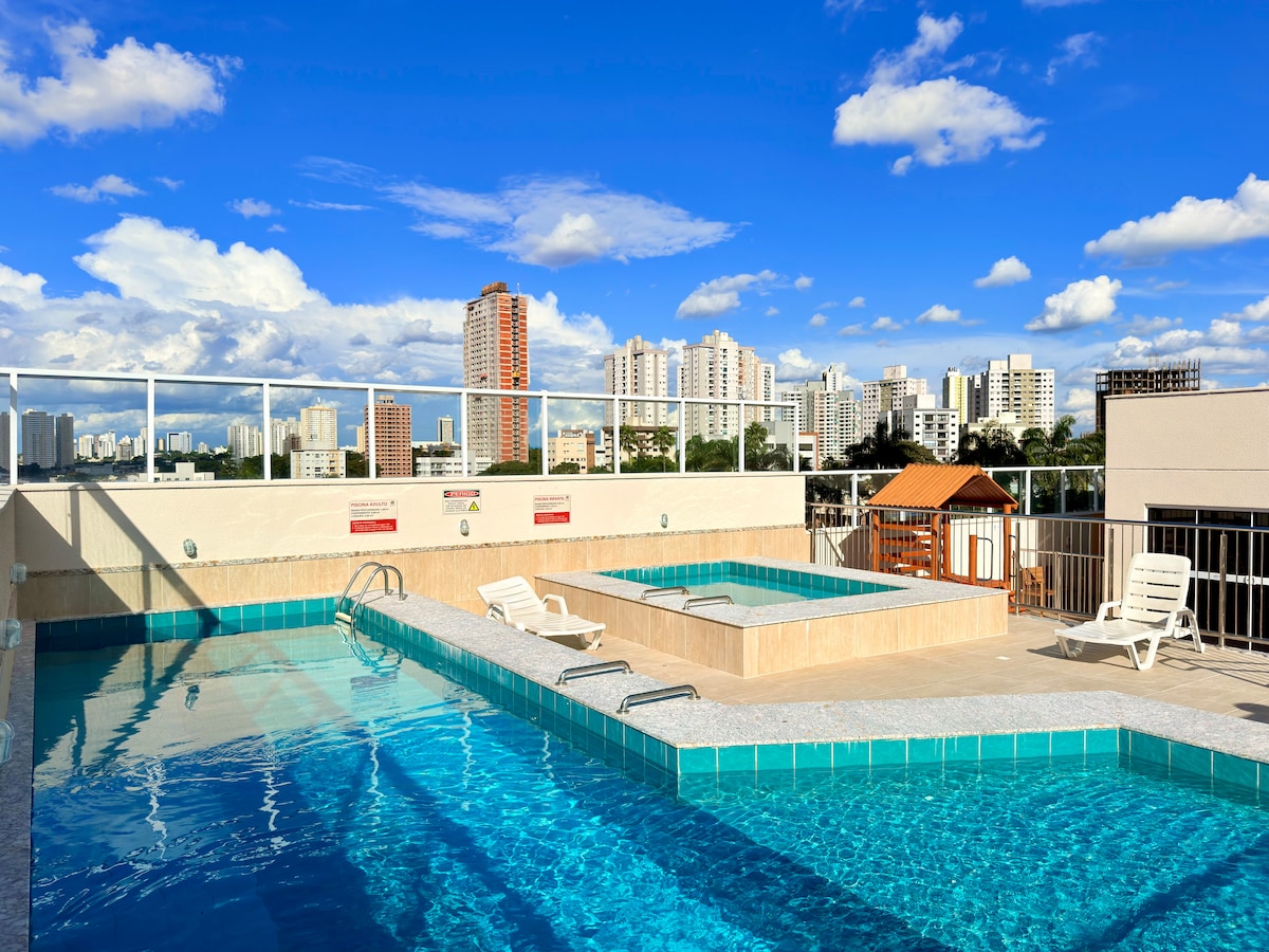 The apartment provides a wonderful view of the city of Goiânia (especially at sunset). It has two bedrooms, with a queen size bed in the suite and a double bed in the second bedroom. The place is new and well equipped with appliances and utensils, as well as a gym and complete leisure facilities on the roof of the building.