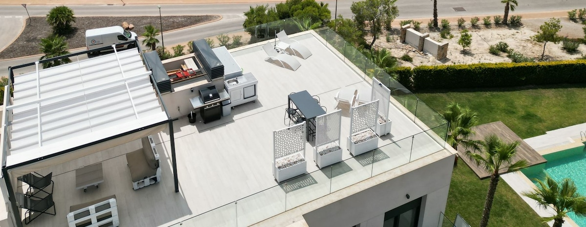 Lehne dich zurück und entspanne dich in diesem ruhigen, stilvollen Raum. Große offene Wohn- und Küche mit toller Aussicht über den Pool und Golfplatz, 4 Schlafzimmer und 2,5 Bäder, alle auf einer Ebene. Parkplätze für 2 Autos auf dem Grundstück, mit elektrischem Tor. Anrufsystem am Einfahrtstor. Entspannter und schöner Außenbereich mit Grill, großem Pool, Dusche, Pergola, Putting-Green und schöner Bepflanzung. Große Dachterrasse mit herrlichem Blick auf die Gegend und weiter hinaus zum Mittelmeer.