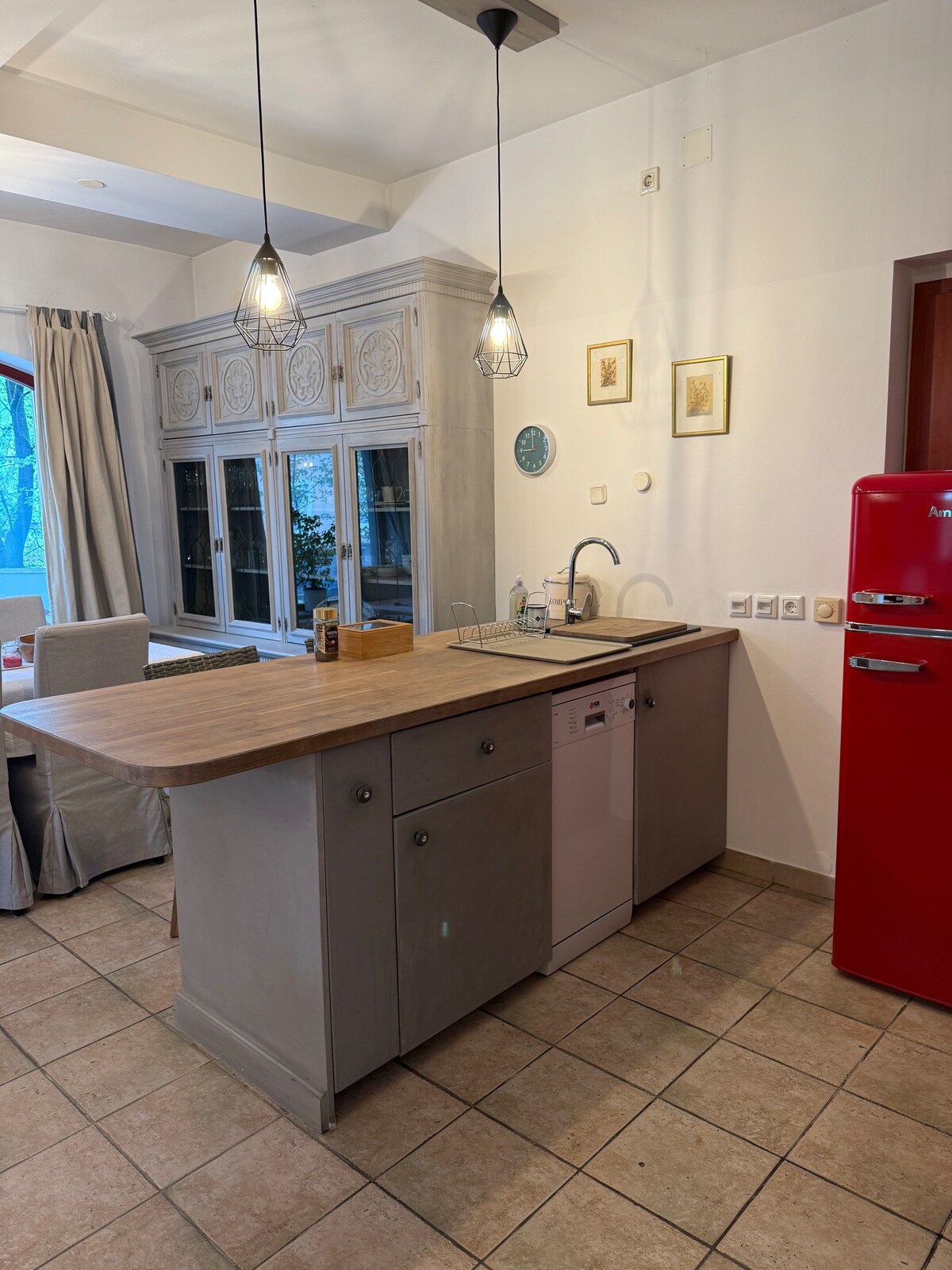 35 m ² Shabby-Chic, Halbkeller, Garten-Zugang. Ein separates Schlafzimmer mit Queensize-Bett und einem separaten Badezimmer. Wohn- und Essbereich mit einem komfortablen Schlafsofa für eine 3. Person. Die Küchenausstattung umfasst einen Minikühlschrank, eine Mikrowelle, einen Toaster und einen Wasserkocher. Kein Herd. Kaffee und Tee werden bereitgestellt. Der Sitzbereich im Freien ist vor der Wohnung und du kannst sie so viel nutzen, wie du möchtest. Kostenloser Privatparkplatz auf dem Grundstück. Lebensmittelgeschäft ist nur wenige Schritte entfernt, geöffnet von 7:00 bis 21:00 Uhr
