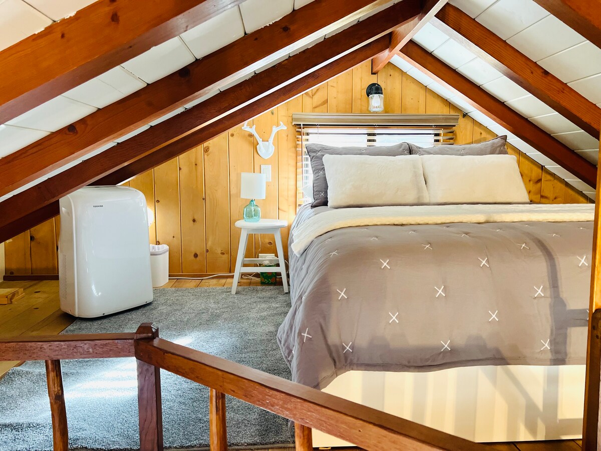 Erlebe die kühle Brise, die diese gemütliche und stilvolle A-Rahmen-Hütte in den Bergen von Prescott zu bieten hat. Genieße den morgendlichen Sonnenaufgang auf der 400 Quadratmeter großen Terrasse mit Bergblick oder genieße abends ein Glas Wein, während du grillst und dich an der Propangas-Feuerstelle aufwärmst. Dieser Raum eignet sich hervorragend für einen ruhigen Paarurlaub und eine kleine Gruppen- oder Familienzusammenkunft, da er Platz für bis zu 6 Personen mit 2 separaten Schlafplätzen und einem Schlafsofa auf der Hauptebene bietet. **Kamin nicht verfügbar.