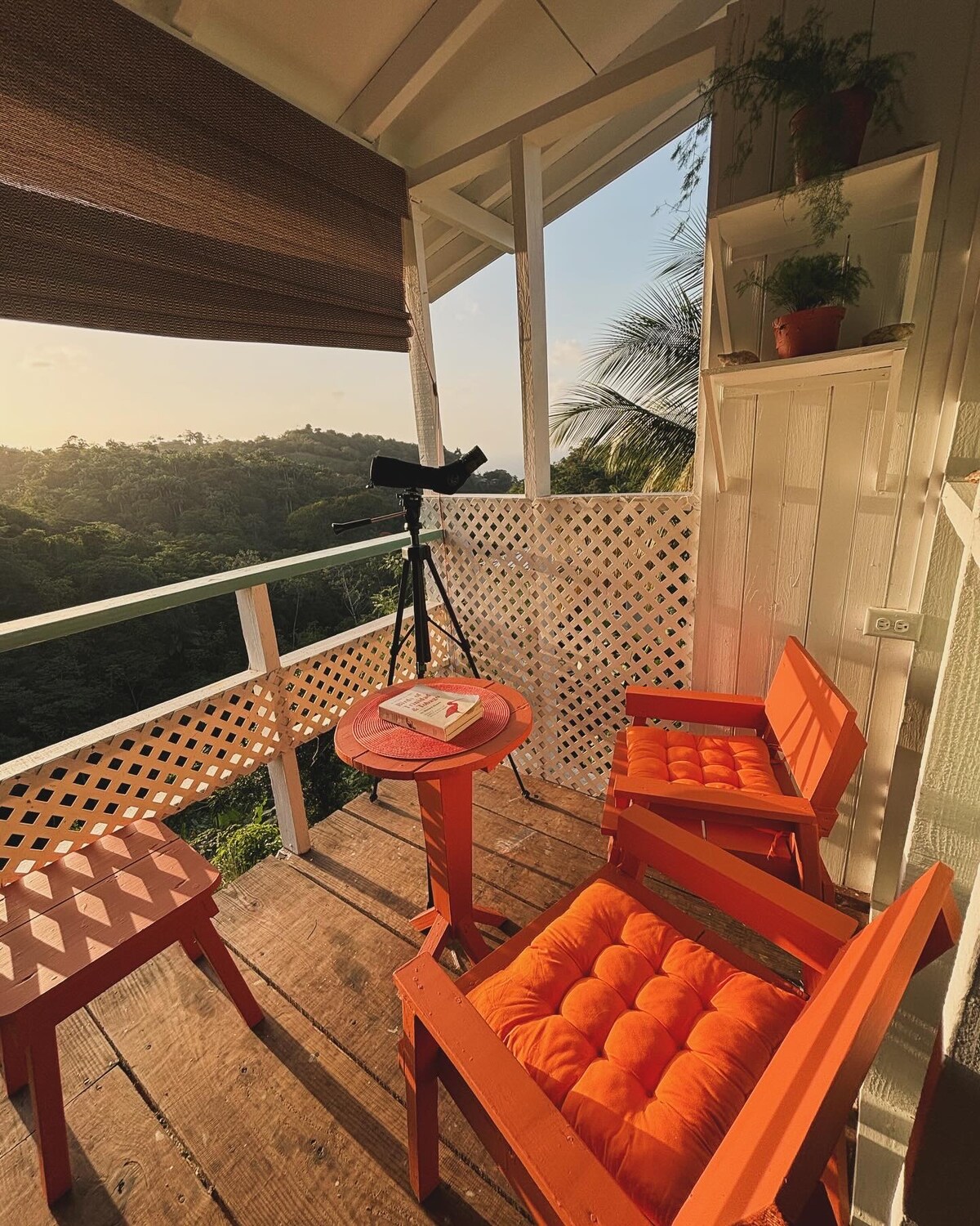 Self-Catering SunsetView is an entire 2-bed 2-bath upper-floor apartment at Castara Roundhouse with a spectacular 200° wraparound balcony overlooking the sea, village, and rainforest. There’s an open-plan living room and kitchen with wooden shutters that open fully onto the balcony. Both bedrooms have ensuite bathrooms, and the space is naturally cooled by ocean breezes, finished in natural wood and concrete for relaxed Caribbean luxury and unforgettable sunsets. 55" TV -Prime/Netflix & Chill