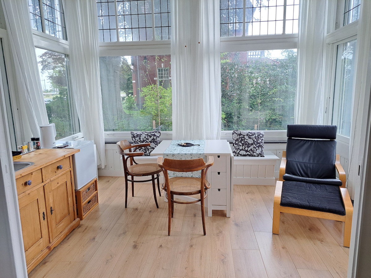 Licht en ruim, met ruim 50m2 is er genoeg ruimte voor een luxe verblijf voor 2 personen. Keuken, kamer, badkamer, aparte toilet en slaapkamer zijn allen nieuw en luxe. We hebben de zelfstandige studio ingericht met materialen van hoge kwaliteit. Zoals je het zelf thuis ook zou willen. Hoewel wij geen ontbijt serveren zorgen we bij aankomst altijd voor een koelkast gevuld met wat drankjes, boter, yoghurt/kwark, eitjes, jam. Ook zijn er ontbijtgranen, olie/azijn, suiker, koffie en thee.
