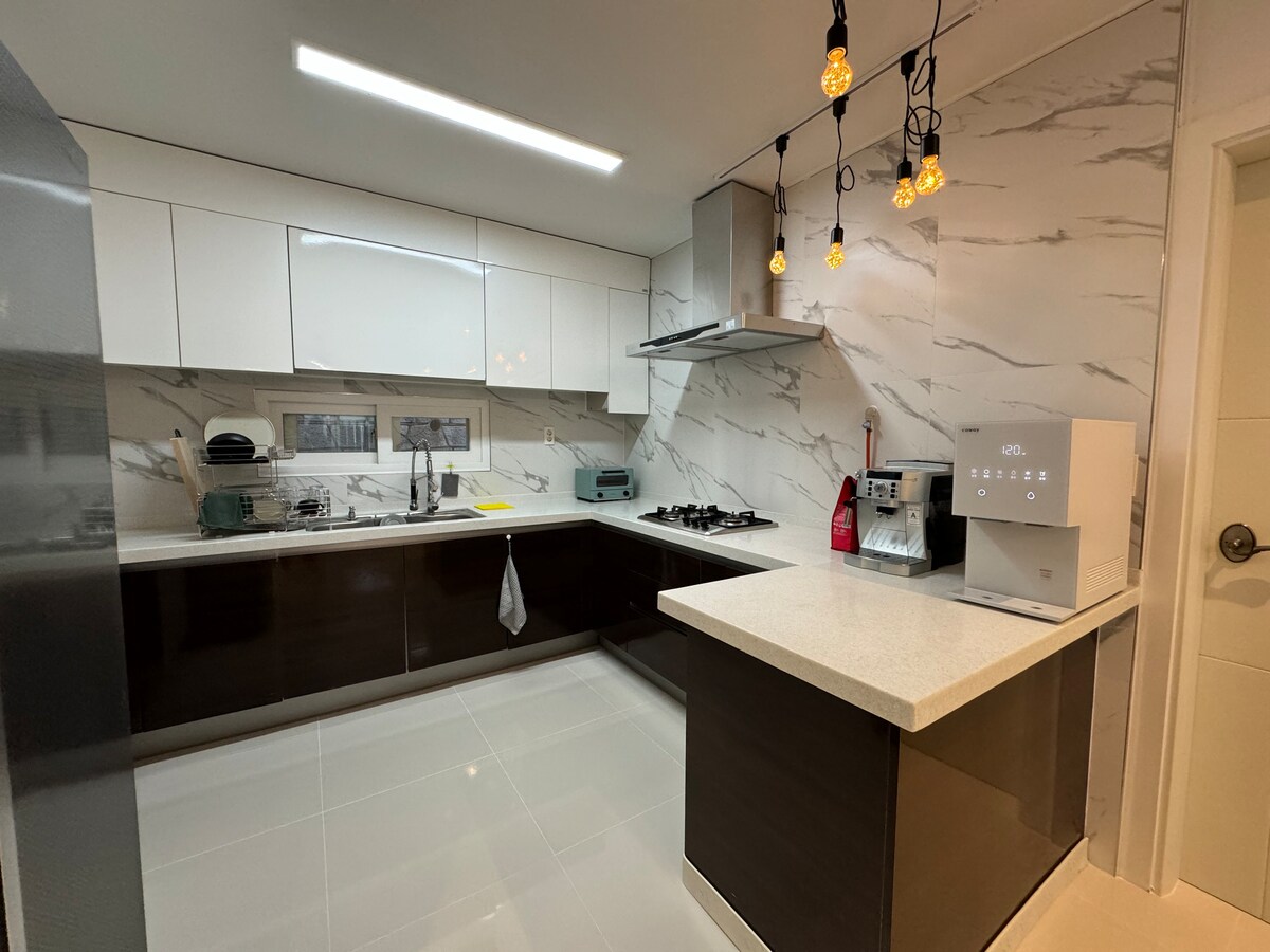 Hallo. Heute ist auch ein heller Tag mit einem warmen Gefühl und Komfort. -Hwachang House befindet sich immer noch in Geoje City in der Adresse, ist aber bequem für Sightseeing in Geoje und Tongyeong, da es eine Brücke zwischen Tongyeong und Tongyeong hat. Bitte beachte die ungefähre Lage sorgfältig auf der Karte unten. - Es gibt eine Küche in der Unterkunft, sodass du einfache Mahlzeiten zubereiten kannst. Hab Spaß mit deinen Liebsten. - Anstatt keinen Fernseher zu haben, gibt es einen Strahlprojektor. Wir stellen Netflix zur Verfügung. - Wir versuchen, den sauberen Zustand der Unterkunft aufrechtzuerhalten. - Es gibt einen Parkplatz pro Zimmer, damit du dir keine Sorgen um das Parken machen musst. - Auf der Dachterrasse befindet sich ein Gemeinschaftsbereich auf dem Dach, in dem du dich entspannen und den Grill nutzen kannst. Es gibt eine separate Gebühr für den Grill, sodass du ihn nach der Buchung nutzen kannst, also kontaktiere uns bitte und wir werden dich freundlich unterstützen.