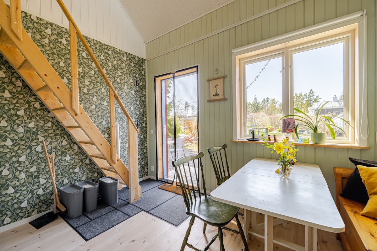 Kommen Sie und genießen Sie die Natur mit der Familie in unserem gemütlichen kleinen Gästehaus. Im Garten gibt es Hühner und Kaninchen. Gut geeignet für Familien mit Kindern, da es Schaukeln und einen Sandkasten gibt. In der Nähe des Sees, wo Sie schwimmen können, und eines Naturschutzgebietes mit schöner Natur. Dennoch ist es nur 20 Minuten mit dem Auto oder Bus vom Zentrum von Uppsala entfernt. Wenn Sie mit dem Fahrrad unterwegs sind, dauert es 35 Minuten ins Zentrum. Das Haus ist neu und schön mit einem geräumigen Schlafloft mit fünf Schlafplätzen (ein 80 cm Bett und zwei 160 cm Betten) und einer gemütlichen TV-Ecke.