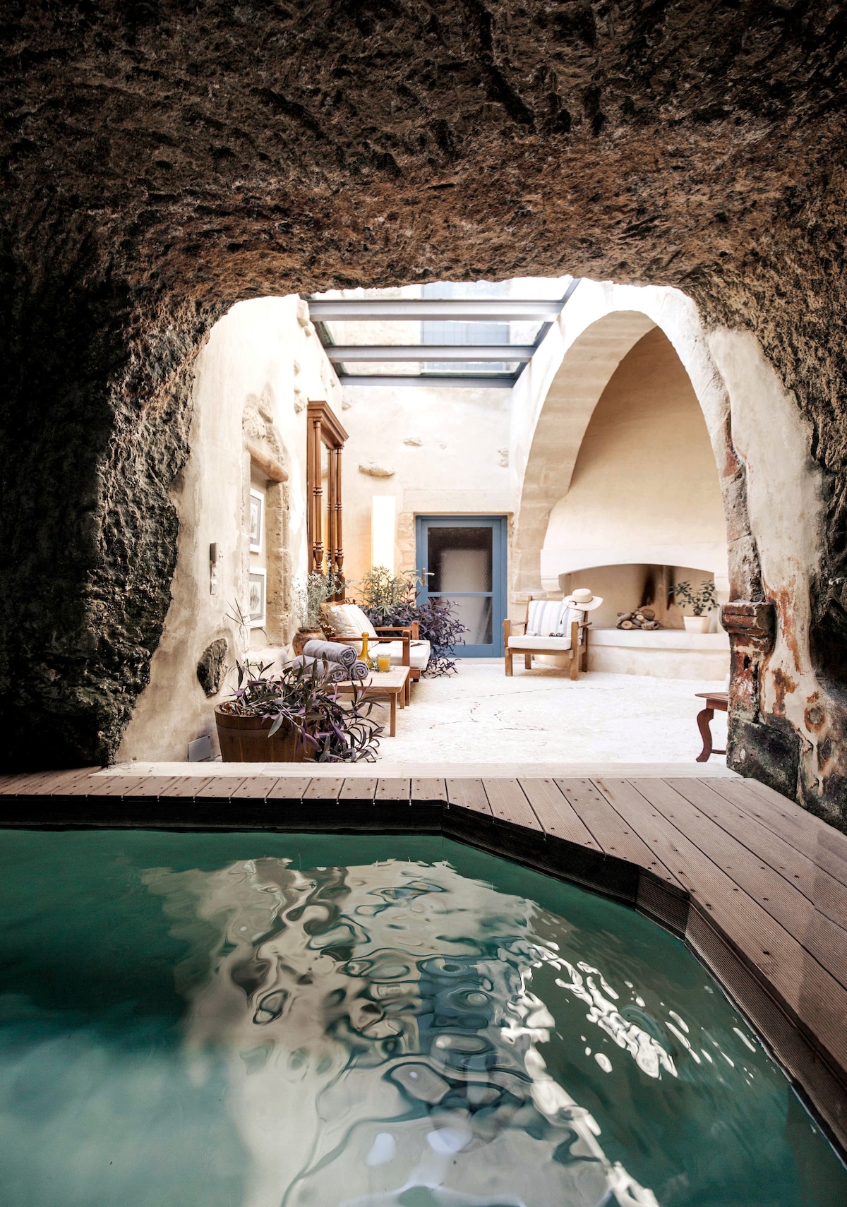Ein komplett renovierter, steinerner Komplex, der auf drei antiken griechischen Grotten errichtet wurde. Früher war es eine venezianische Olivenpressenfabrik. Jetzt ist es ein modernes Ferienhaus mit zwei Pools (Innen- und Außenpool) und einem Bio-Gemüse- und lokalen Obstgarten.