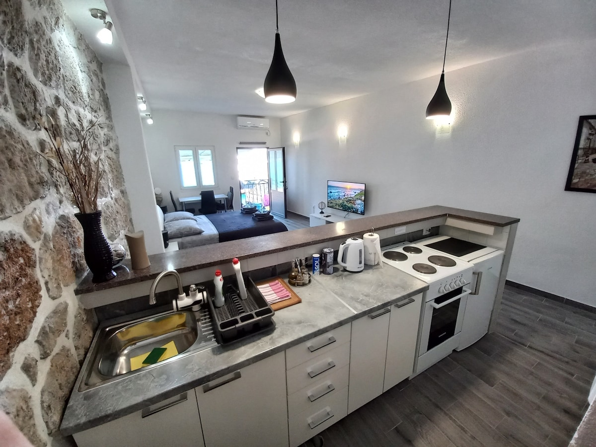 "Studio Polače" befindet sich im Nationalpark Mljet in Polace, 20 Meter vom römischen Palast, 10 Meter vom Meer entfernt, voll ausgestattet und sehr modern. In der Nähe befinden sich Geschäfte, Bäckerei, Restaurants, Fahrrad, Auto und Roller zu vermieten, NP-Eingang. Die Wohnung verfügt über eine Terrasse mit einem schönen Blick auf den Hafen. Polace bietet eine Vielzahl von Restaurants, in denen Sie mediterrane Küche genießen können. Leihen Sie sich ein Fahrrad, machen Sie einen Spaziergang und genießen Sie die schöne Natur. Seen sind nur 3 km von der Wohnung entfernt.