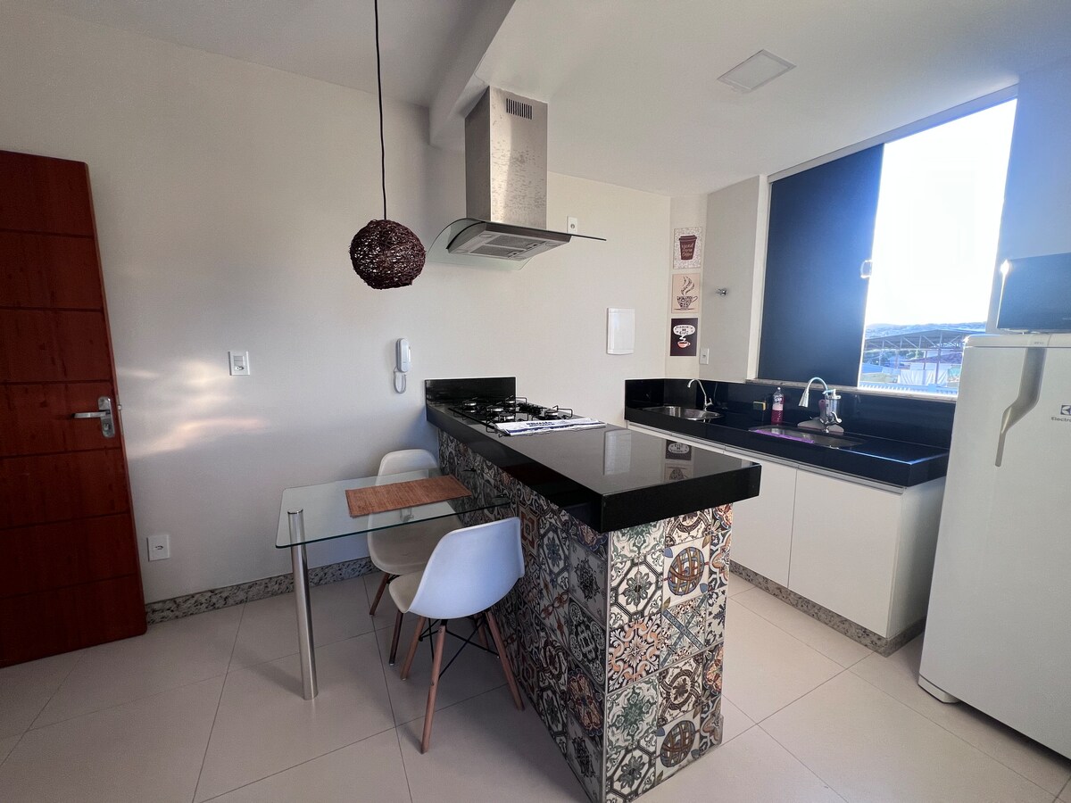 Flat confortável localizado no Vila Bretas. Seguro e bem localizado. Contamos com garagem, sistema de vigilância por monitoramento por câmeras 24h/dia. Perto de supermercados, farmácias, bancos e padarias. Flat com sacada com vista para Ibituruna, chuveiro quente, geladeira, sanduicheira, talheres e afins.