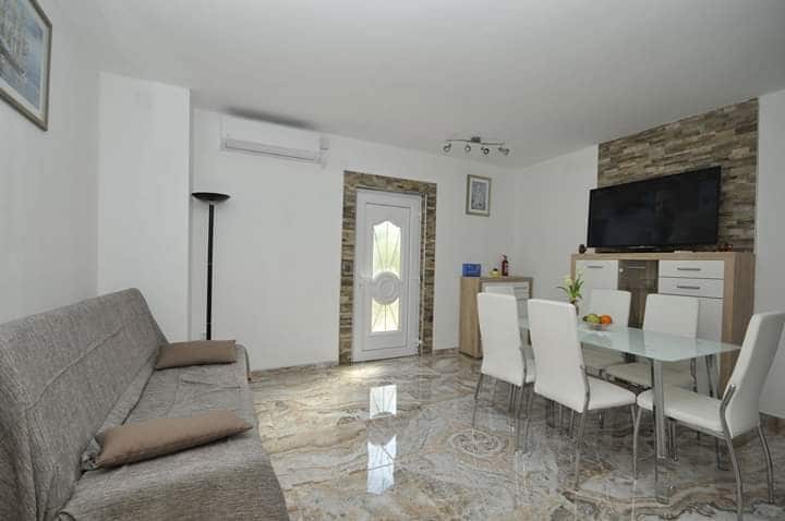 A brand new,stylish apartment with a charming balcony has all the modern gadgets to meet your every need.Located between the two Unesco cities,Split 12 km and Trogir 8 km and in the vicinity of airport 3 km. The apartment is located on the first floor of the private house.The living room features a flat smart TV,free Wifi internet,air conditioning and a nice,spacious sofa. This 75 sq aparment is close to the city beach,800 m walking distance. There is a private parking area available for you.