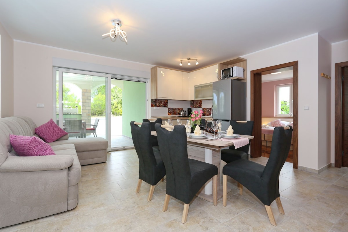 Willkommen an einem malerischen Ort im Mittelmeer mit perfektem Mikroklima, weshalb Gäste immer wieder zurückkommen. Sie verbringen Ihren Urlaub in einer Wohnung (4+4) im Erdgeschoss eines Einfamilienhauses mit einem großen Innenhof, der reich an Oliven-, Feigen- und Oleanderbäumen und mediterranen Kräutern ist. In der Nähe des Strandes, aber weit genug, dass Sie sich in Abgeschiedenheit zurückziehen und qualitativ hochwertige Erholung genießen können, wann immer Sie möchten. Gastgeber treffen dich persönlich und stehen dir rund um die Uhr zur Verfügung, um dir bei allen Fragen zu helfen.