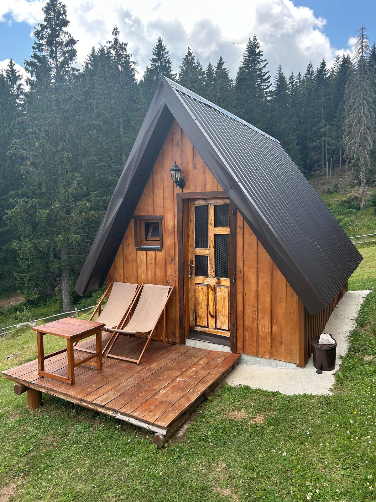 Übernachte in unserer gemütlichen A-Rahmen-Hütte, die in den Hügeln nur 3 km von der M20-Straße in Tjentište, direkt im Nationalpark Sutjeska, liegt. Sie befinden sich auf dem Weg nach Maglic, dem Urwald von Perućica und dem Trnovačko-See, ideal für Wanderer und Naturliebhaber. Die Hütte bietet Platz für 2-4 Gäste (plus ein Sofa für einen 5.), mit eigenem Bad, Küchenzeile und kostenlosen Parkplätzen. Ein lokales Restaurant (Outdoor Tara) ist nur 50 m entfernt und serviert den ganzen Tag hausgemachte Mahlzeiten. Kein WLAN – nur Vögel, frische Luft und eine atemberaubende Aussicht.