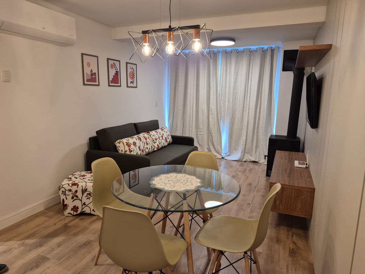 Schönes Apartment mit 1 Schlafzimmer - Queensize-Bett, Schlafsofa + eine Einzelmatratze. 5 Minuten zur überdachten Straße. Voll ausgestattete Küche mit Grill und Spieße, Waschmaschine und Trockner, Kaffeemaschine, Mixer, Warm-Kalt-Klimaanlage, Kamin, Kamin, kompletter Bettwäsche, Garage für ein Auto, das nicht notwendig ist, um es zu nutzen, um es zu nutzen, um sich in der Stadt zu bewegen, da sich die Wohnung im Zentrum und in der Nähe der besten Restaurants, Supermärkte und Geschäfte befindet. Ideal für Menschen mit besonderen Bedürfnissen.