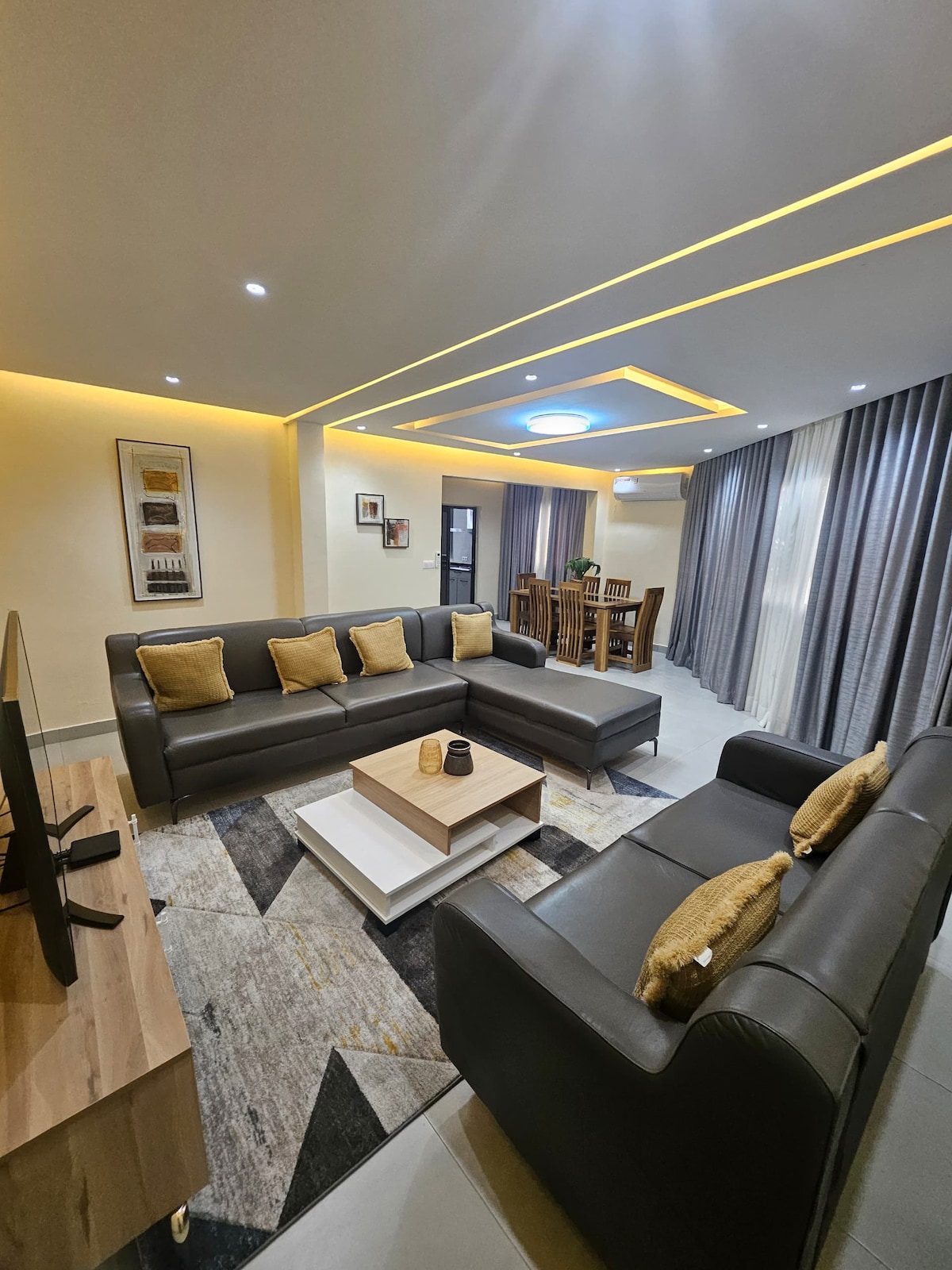 Oubliez vos soucis dans ce somptueux appartement se trouvant au 4ème étage avec ascenseur dans une résidence sécurisée. Sa décoration époustouflante vous fera apprécier votre séjour dans un confort total.. L'appartement est totalement climatisé, équipé de deux grands salons, d’une Smart TV 4K, de la Fibre optique, Netflix, Canal, un service de gardiennage assuré 24h/24. Un van en location peut être mis à votre disposition pour vos transferts à l’aéroport mais aussi pour vos déplacements.