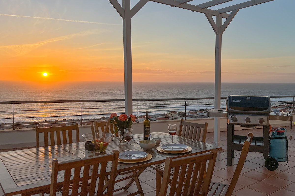 Exklusive Villa mit atemberaubendem Meerblick, komplett mit: 1) privatem Pool, 2) Wohnzimmer, das sich zu einer Terrasse mit Meerblick öffnet, mit Esstisch, Wohnbereich und Hängematte, 3) 4 Schlafzimmern, 4) 3 Badezimmern und 5) geräumiger Küche. Gelegen in einem abgeschlossenen Anwesen mit Tennisplatz, Fußballplatz und mehreren Gärten. Zu Fuß zu mehreren Stränden, Surfspots, Stadtzentrum und anderen Dienstleistungen. Inklusive Willkommenskorb mit lokalen Produkten und einem Ericeira-Guide mit speziellen Tipps.