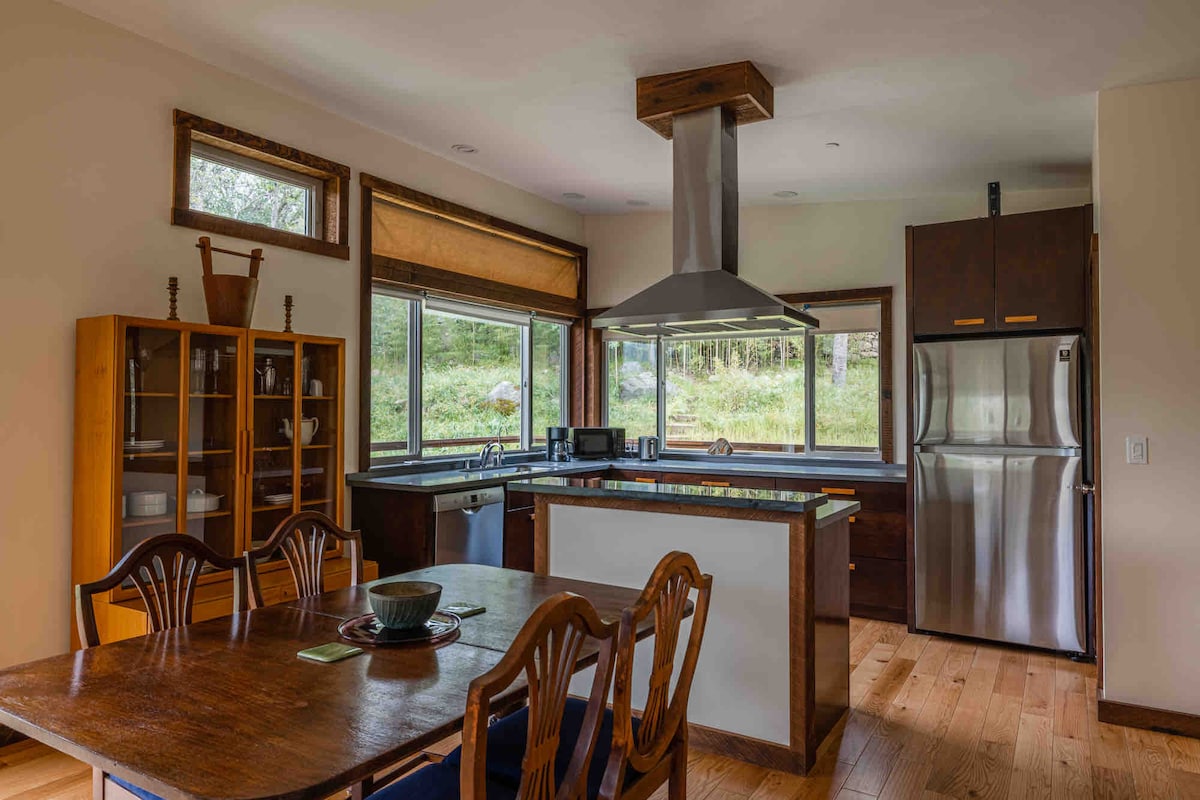 Millwood Cottage bietet Komfort und Bequemlichkeit, ohne das rustikale Gefühl und die private Umgebung zu opfern, die Sie von einem ländlichen Rückzugsort erwarten. Es verfügt über warme Kiefernverkleidungen, gewölbte Decken, einen Großbildfernseher und eine geräumige Küche mit einem 4-Flammen-Gasherd und allen Kochutensilien, die du benötigst. Große Fenster lassen das natürliche Licht herein und öffnen den atemberaubenden Blick auf die Sierra. Es gibt eine Terrasse hinten mit einem Gasgrill und einer Feuerstelle. Schnelles Internet hält dich gut an die Welt angebunden.