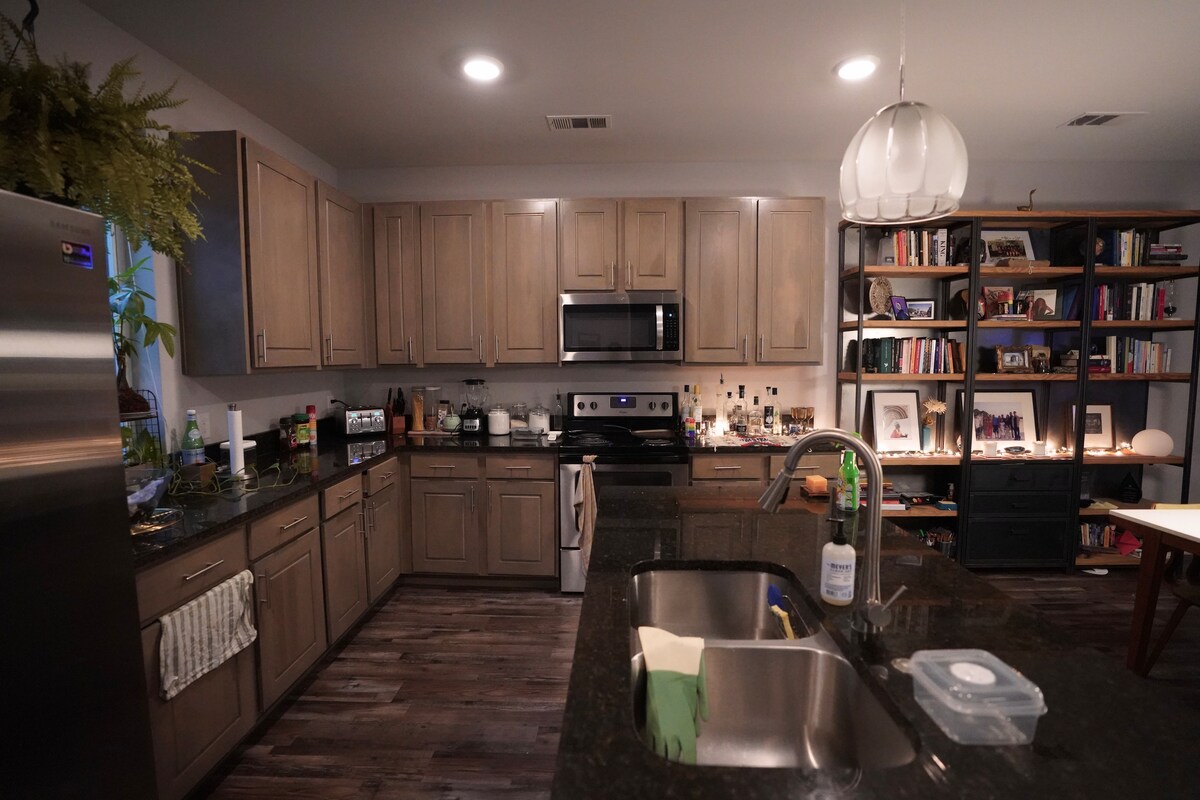 Sorgfältig eingerichtetes Stadthaus in der Innenstadt von Arlington direkt neben UTA!! Modernes Reihenhaus mit allem, was du für deinen Aufenthalt brauchst! 3 Stockwerke, wobei der erste Stock der Eingang und die Garage ist. Die zweite Etage öffnet sich zur Küche, zum Wohnzimmer und zum Essbereich, um das halbe Badezimmer einzubeziehen, und alle werden nicht enttäuschen! Die oberste Etage ist das geteilte Schlafzimmer, und jedes verfügt über ein eigenes privates Bad, in dem Gäste bequem und privat wohnen können. Es besteht eine ausreichende Schalldämmung zwischen den Einheiten.