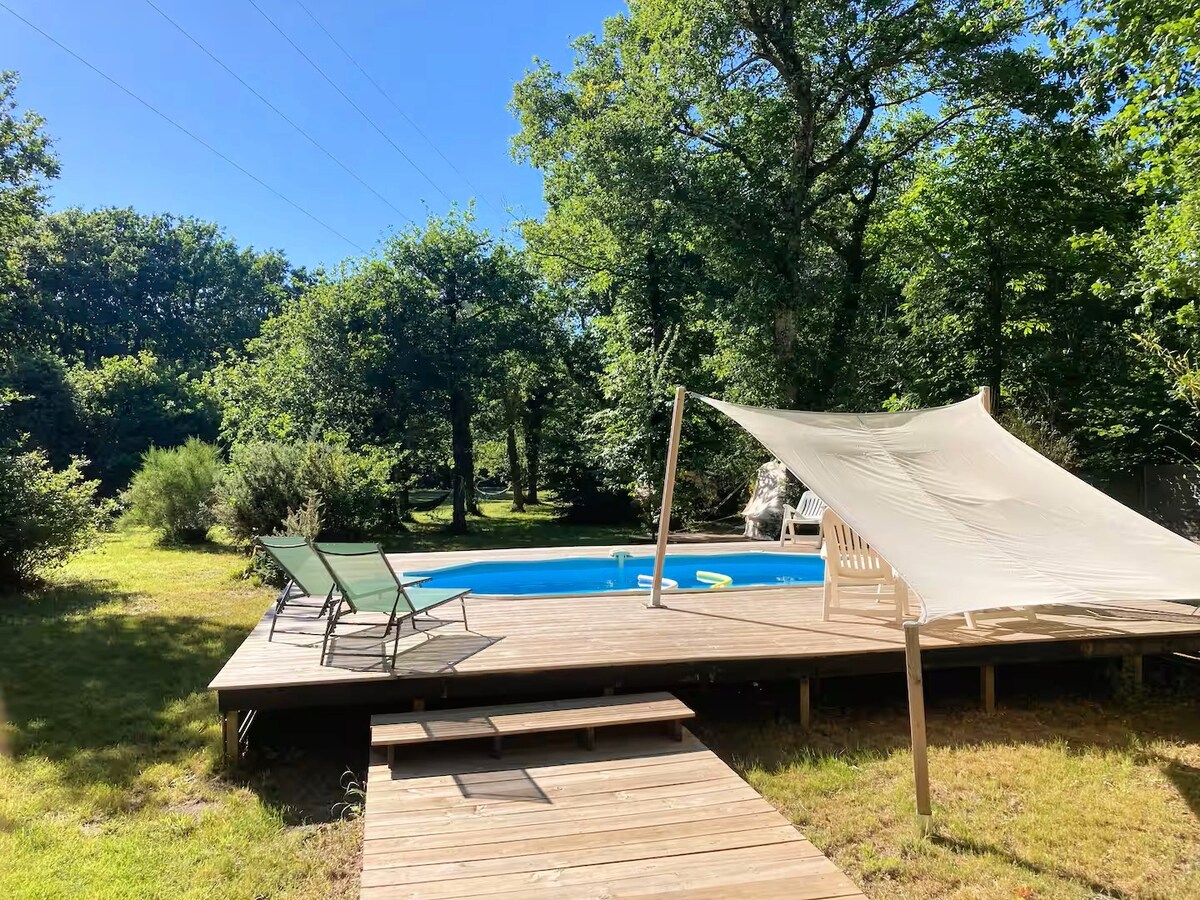 Ein Hektar üppige Natur, ein charmantes kleines Haus und Glamping-Zelte für ein einzigartiges Erlebnis ohne Gegenüber! Gönnen Sie sich eine verzauberte Auszeit im Herzen eines Waldes, nur 5 km von den Meeresstränden entfernt. - Haus, in dem Leben und Natur eins sind - Zwei geräumige Zelte von 25 m² - Beheiztes Schwimmbad von Mai bis Oktober - Ein Hektar nur für Sie, für absolute Privatsphäre