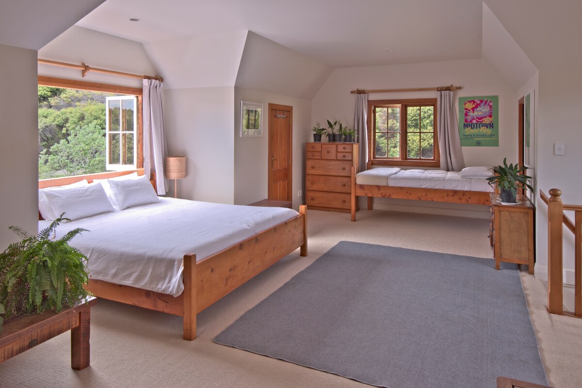 Nestled above the peaceful Kaitoke Creek and surrounded by native bush, Ponga House is a beautifully crafted, light-filled sanctuary offering privacy, comfort, and the wild beauty of Great Barrier Island. This brand-new upper-level retreat is thoughtfully designed for rest and reconnection. Birdsong, bush views, and the gentle rhythm of island life’ll embrace you. Whether you're seeking a romantic escape, a creative sabbatical, or quality time with loved ones, Ponga House is your perfect base.