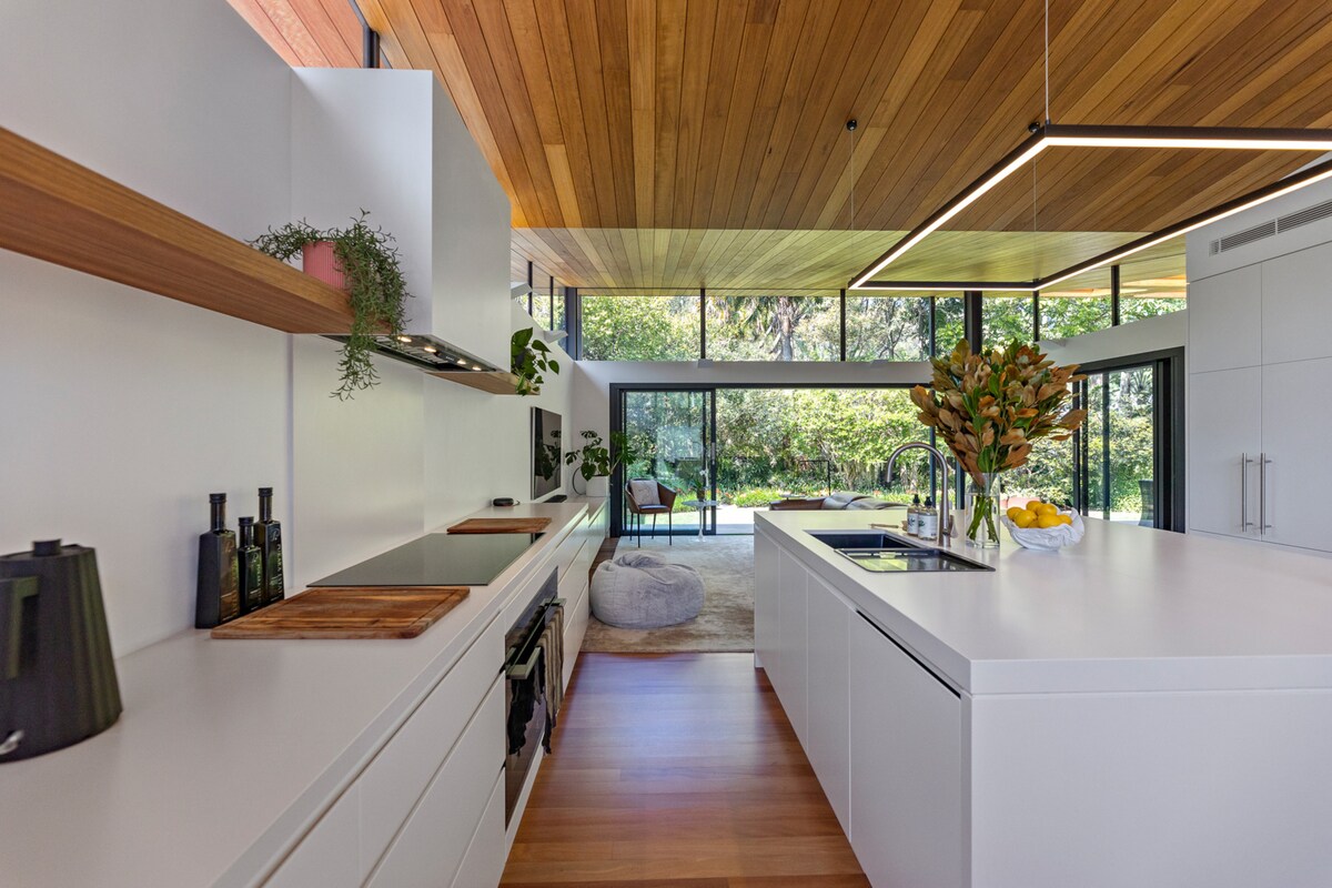 45 Minuten vom CBD entfernt, bietet der Palm Pavilion eine Boutique-Auszeit, um sich mit Angehörigen zu verbinden oder in Ruhe zu arbeiten. Dieses preisgekrönte, vielseitig genutzte Containerhaus befindet sich am Rande des Ku-ring-gai Chase National Park und bietet ein luxuriöses Ambiente und eine durchdachte Architektur, die auf Nachhaltigkeit, Abgeschiedenheit und Ruhe ausgerichtet ist. Mit raumhohen Fenstern mit Blick auf den Regenwald und einer umfassenden Ausstattung ist der Palm Pavilion eine Oase, in der du Lärm hinter dir lassen und das Wichtige mit anderen teilen kannst.