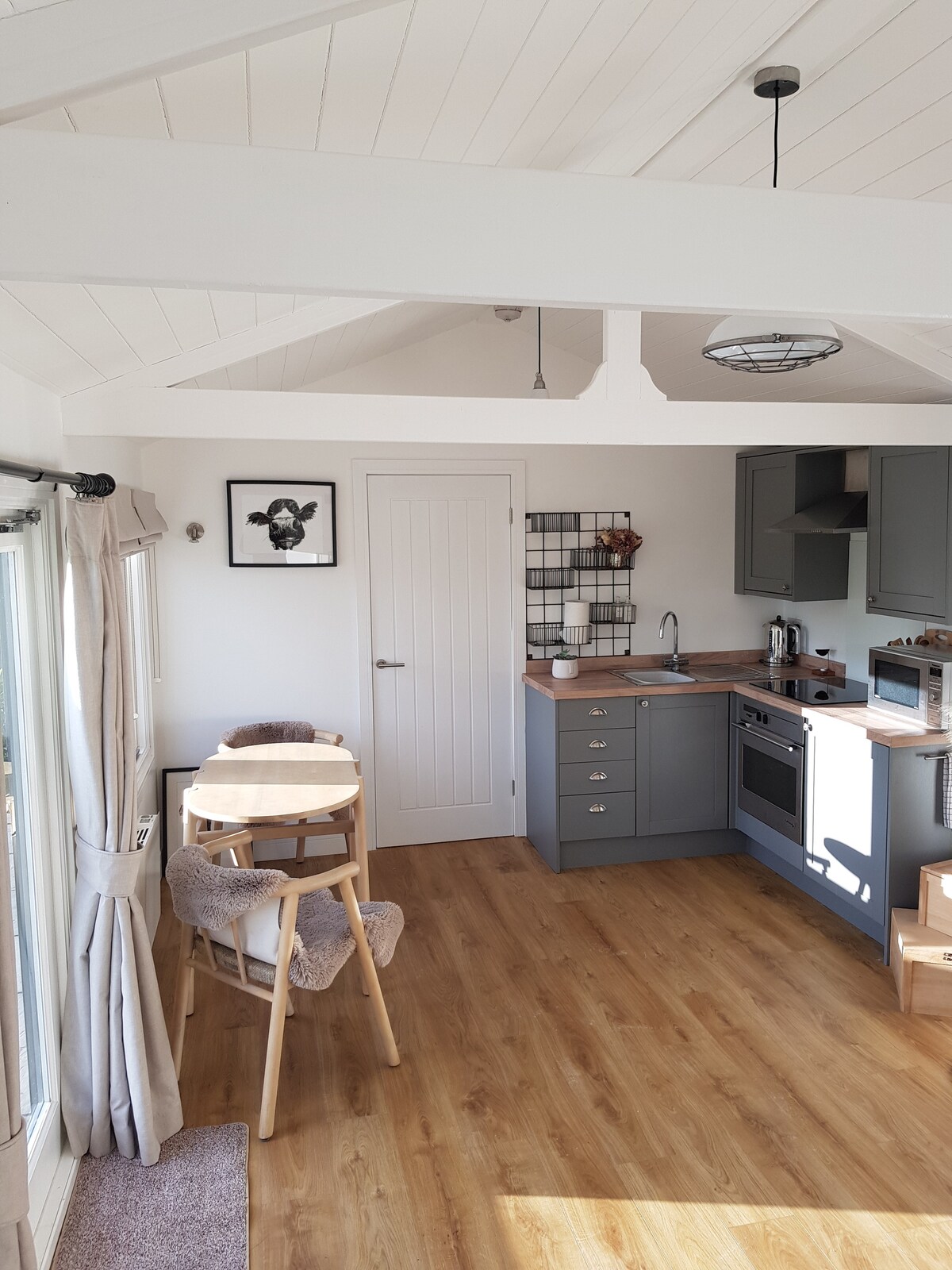 Converted barn with separate access and exclusive use of the entire self-contained space. Private off-road parking with Type 2 Charger for EVs. The bedroom includes a king-size bed and chest of drawers for storage. HD TV in lounge; WiFi (95mbps down); Alexa speakers with smart lights throughout (you can still just use the switches);voice-activated smart heating (again, you can just press the buttons); the fully-fitted kitchen includes kettle, microwave,FF, oven, and a Nespresso coffee machine.