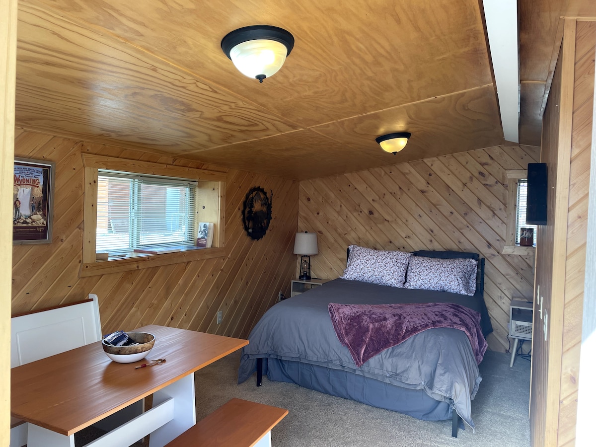 Die Riverbend-Hütte wurde 2020 am Ufer des Pine Creek neu gebaut. Der offene Wohnbereich verfügt über einen Fernseher, eine Sitzecke, einen Gaskamin, ein Murphy-Bett, einen kleinen Essbereich und eine große Küche. Das Hauptschlafzimmer verfügt über ein Kingsize-Bett und einen kleinen Kleiderschrank. Die große überdachte hintere Terrasse ist der perfekte Ort, um eine Mahlzeit zu genießen oder einfach nur zu entspannen und die Aussicht zu genießen. Wir sind etwas außerhalb der Stadtgrenzen und dennoch ganz in der Nähe der Stadt. Genieße die Ruhe und den Frieden, während du in der Nähe von allem bist, was Pinedale zu bieten hat!