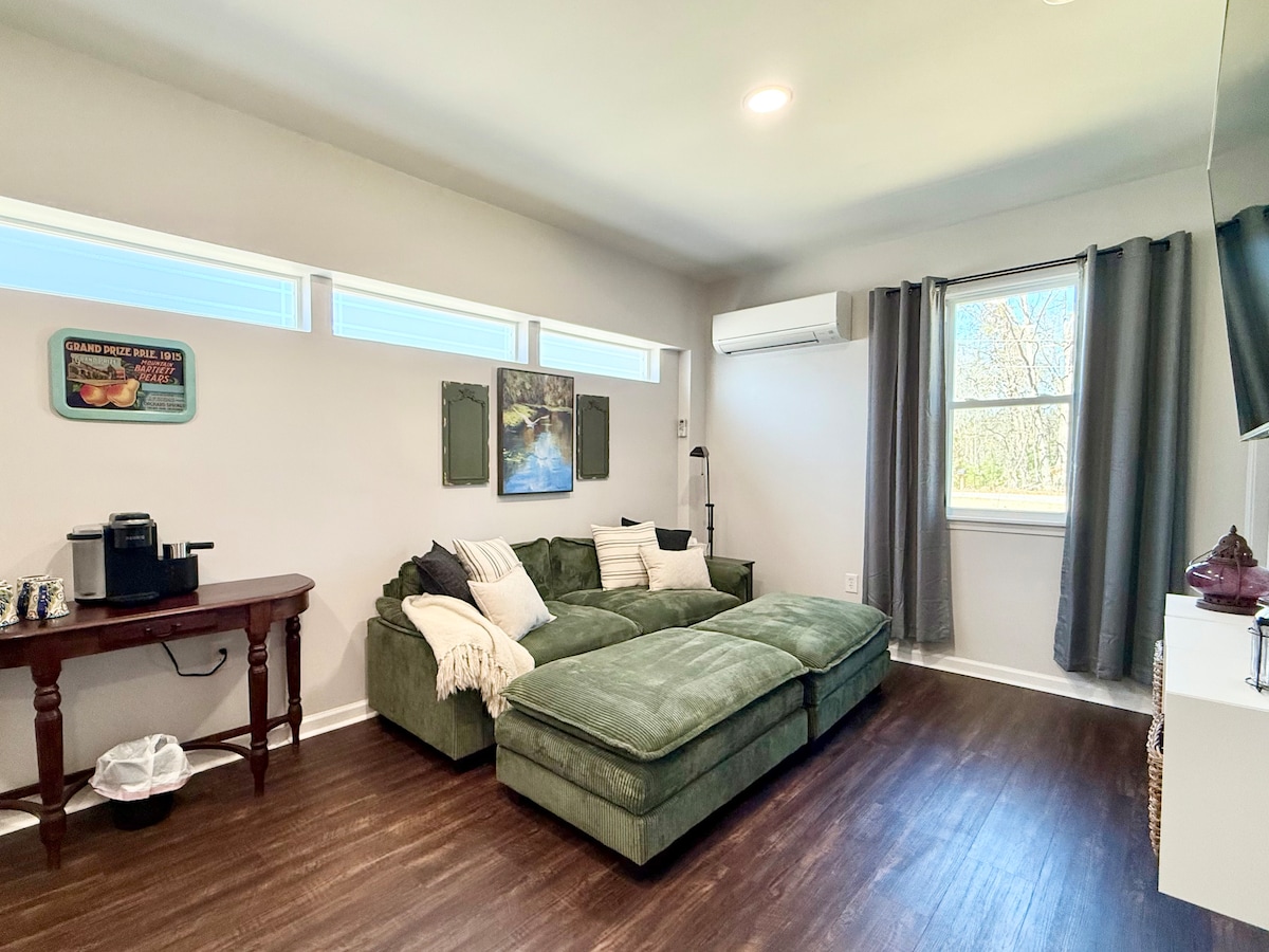 Your secluded retreat on Paris Mountain, this small private suite with separate entrance includes one bedroom, one bathroom, and an adjoining kitchenette. The space is newly-renovated and immaculately clean. Located just 10min from downtown Greenville, yet on the privacy of a 3-acre wooded lot. You will have exclusive access to a patio dining area and firepit. Explore hiking paths and native plant gardens. Separate entrance and your own driveway. Children welcome.
