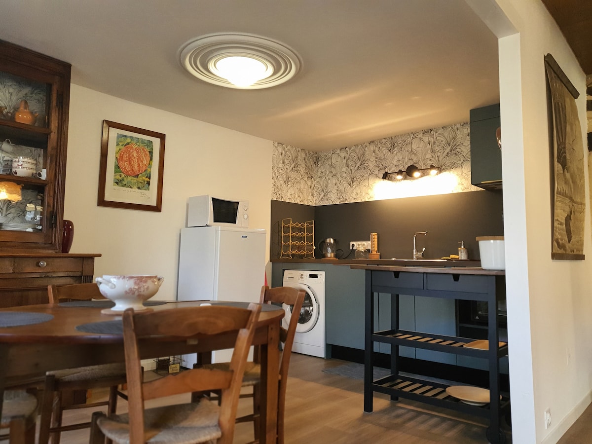 Gîte 3 pers. dans ancien corps de ferme rénové, cadre champêtre et très calme. Grande pelouse close, terrasse couverte, transats, salon de jardin, barbecue. Séjour lumineux avec canapé convertible, TV, lecteur DVD. Cuisine équipée : réfrigérateur, micro‑ondes multifonctions, lave‑vaisselle, plaque induction, service à raclette, cafetière, grille‑pain. Salle d’eau avec douche à l’italienne, sèche‑cheveux, lave‑linge, WC séparés. Chambres lit 140 et 90 Chauffage, climatisation, internet inclus.
