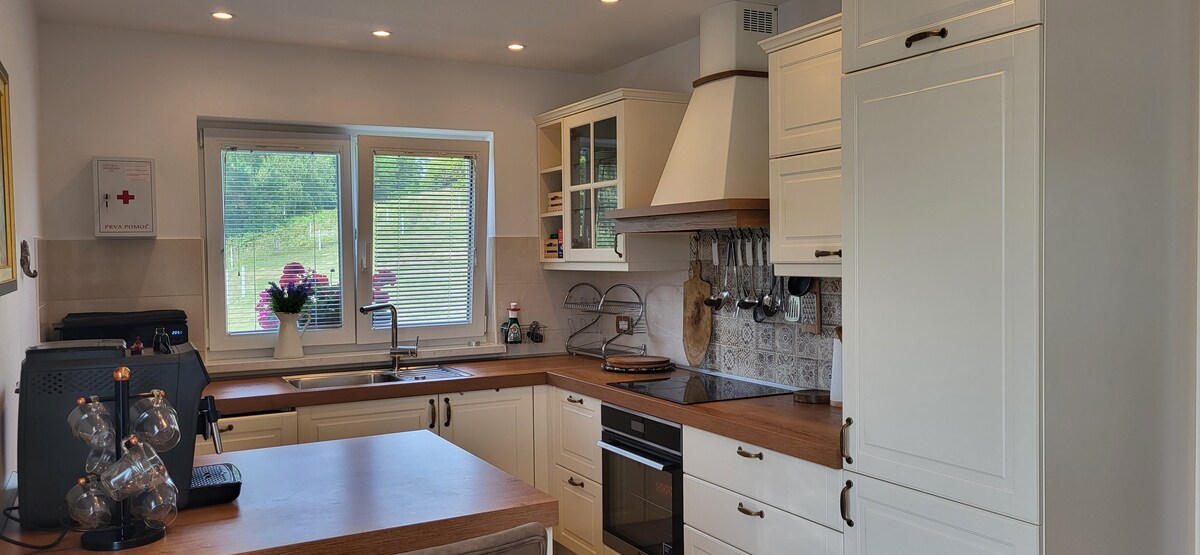 Zasebna hiša z velikim in urejenim posestvom je odlična izbira za popoln oddih in regeneracijo ali za aktivno preživet čas v naravi. Obdaja jo veliko zelenih in urejenih površin, gozd , ter orehov nasad, ki šteje natančno 100 dreves. Hiša je na novo opremljena in primerna za bivanje 4-6 oseb. Na voljo je balkon s teraso , pokrit prostor za žar ali zunanjo jedilno mizo in vinska klet.