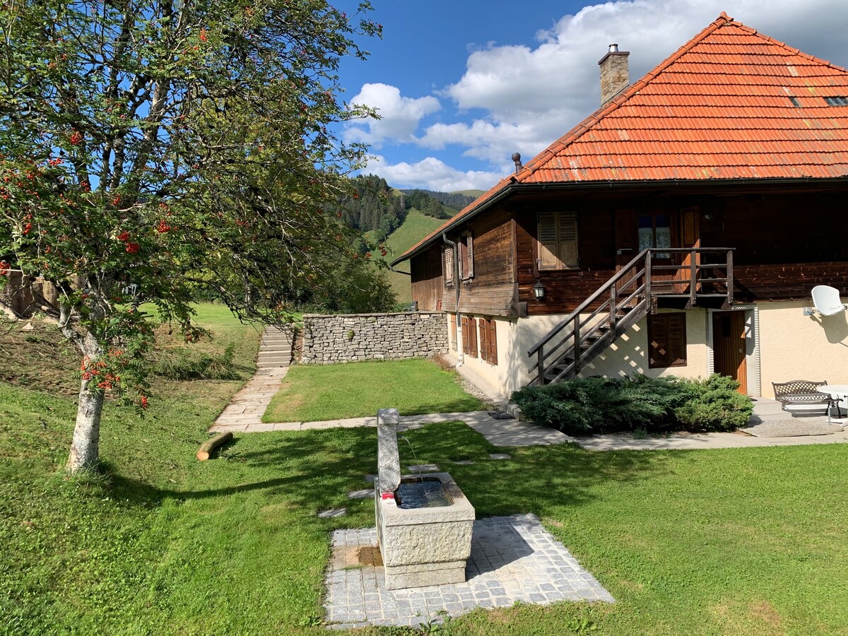 Dieser magische und paradiesische Ort, einzigartig, völlig privat, genießt eine außergewöhnliche, ruhige, sehr sonnige Lage mit herrlichem Blick auf das Javroz-Tal, im Gruyère, auf 1.000 m Höhe, mit unzähligen Wanderungen in der Umgebung . In einem renovierten alten Bauernhaus, umgeben von großen Grünflächen zum Ausruhen, Essen, Spielen, ist diese Wohnung (Erdgeschoss) ideal für ein Paar oder eine Familie ( max 3 Erwachsene ), die Ruhe und Natur pur suchen.