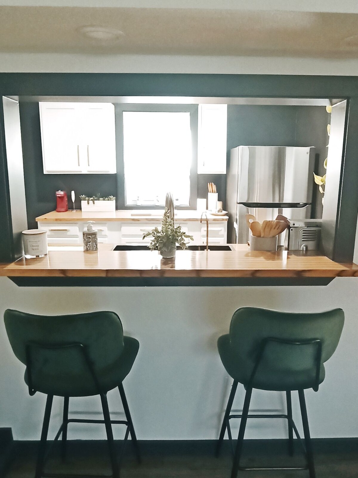 Von oben bietet unsere Wohnung einen ruhigen Blick auf üppige Bäume und bietet eine ruhige Atmosphäre. Das Highlight ist eine geräumige, gut ausgestattete Küche mit allen neuen modernen Geräten. Ein gemütliches Queensize-Bett ziert das Schlafzimmer. Das extra große Badezimmer verfügt über eine erfrischende Dusche und viel Platz an der Theke. Es gibt auch einen schönen Schreibtisch, falls du etwas erledigen musst. Insgesamt ist es ein komfortabler Rückzugsort für zwei Personen, der Funktionalität mit einem Hauch von Ruhe verbindet.