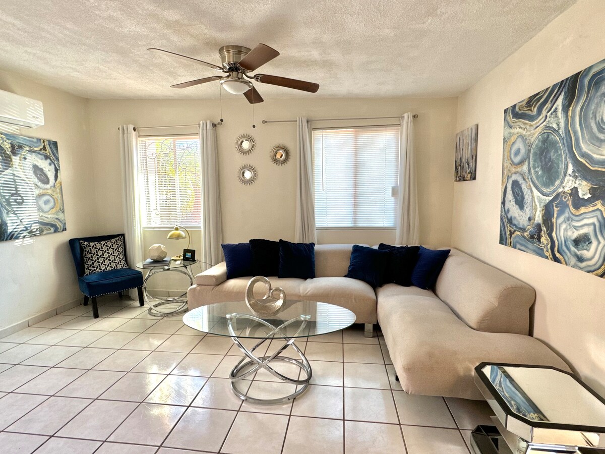 Komplett neue Wohnung, Ihre Familie wird in der Nähe von allem sein, wenn Sie in dieser zentralen Unterkunft übernachten. Die Wohnung befindet sich im Herzen von Guaymas, zwei Blocks vom Malecón, 10 Minuten vom Strand Miramar und 20 Minuten von San Carlos entfernt Für Ihre Ruhe und Sicherheit haben wir eine geschlossene Schaltung in der Privatstraße (Überwachungskameras), ein elektrisches Tor mit geschlossener Garage für Ihr Fahrzeug.