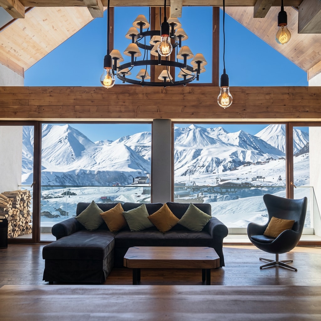 Schöne Chalet-Atmosphäre Wohnung mit Panoramablick auf die Berge im Herzen des New Gudauri Skigebiets 2300 m über dem Meer, in der Zwillingsresidenz. Minimalistisches Design, natürliche Texturen und atemberaubende Aussicht. Genieße den atemberaubenden Blick auf das Tal von Gudauri und die Skipiste sowie atemberaubende Sonnenuntergänge, während du ein heißes Bad nimmst. Bergbäche, der sich ständig verändernde Himmel, Viehherden mit Hirten und unvergessliche Gewitter in der Nacht im Sommer. Beliebtes Kazbegi ist 40 Fahrminuten entfernt.
