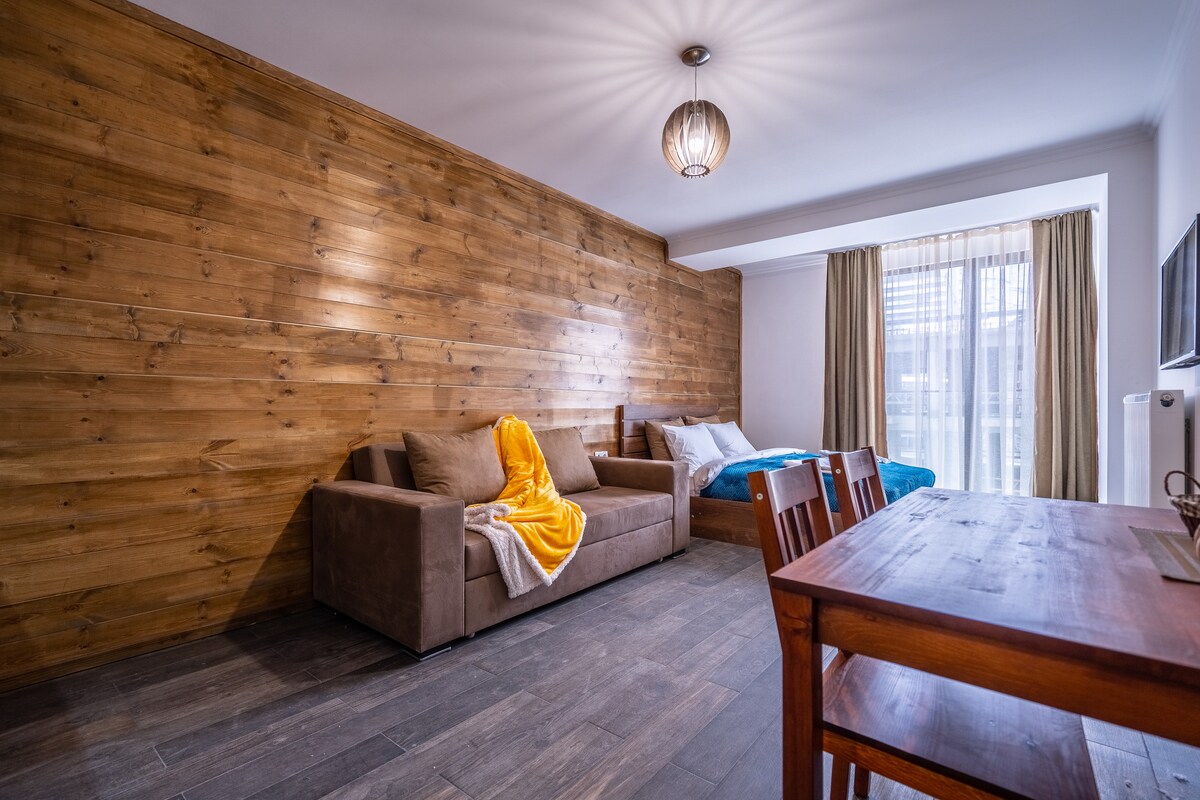 Welcome to our bright and cozy apartment in the heart of New Gudauri! Just steps away from the ski resort, gondola, and ice rink. Our stylish home features a balcony with stunning mountain views, a fully equipped kitchen, comfortable bedroom, two sofa beds, and a ski storage area. Experience comfort, style, and the magic of Gudauri all in one place!