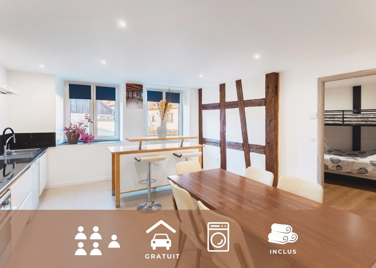 Ein kleines atypisches und gemütliches Studio über den Dächern der mittelalterlichen Stadt Munster. Perfekter Kurzurlaub für Besucher, die das Elsass in einem schönen Studio entdecken möchten, das die Wärme eines Holzchalets mit der Eleganz eines modernen Loft-Designs verbindet. Das Studio ist komplett für kurze oder längere Aufenthalte ausgestattet, mit einer offenen Küche, einem Wohn-/Esszimmer, einem modernen Badezimmer und einem Schlafbereich und einer Bibliothek.